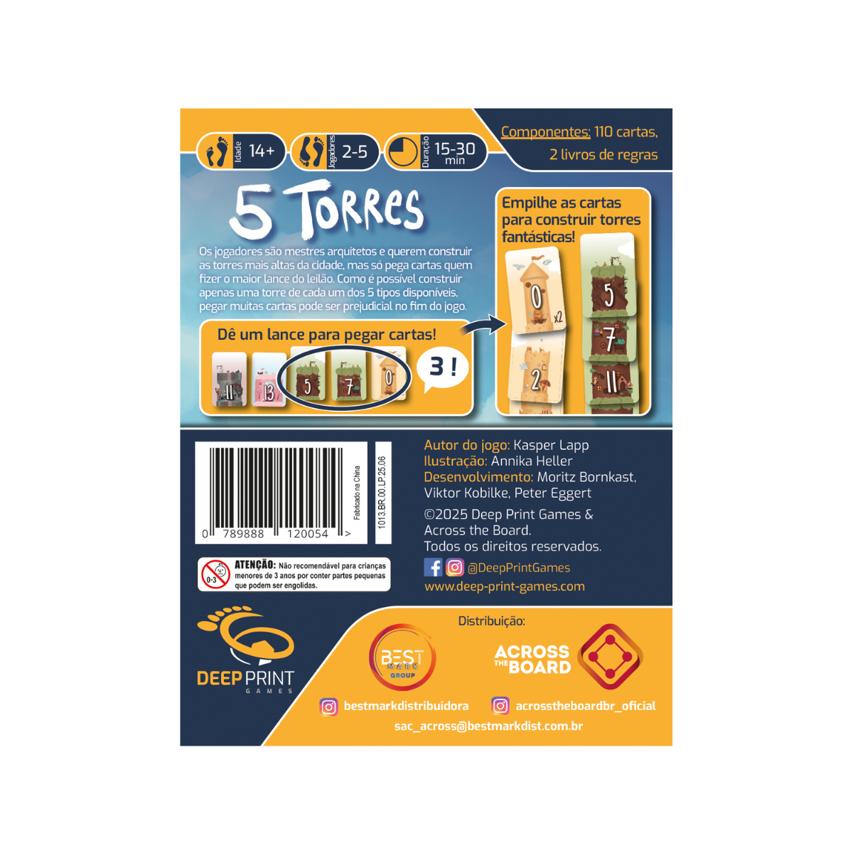 Os jogadores são mestres arquitetos e querem construir as torres mais altas da cidade. A cada rodada, 5 cartas – os blocos de construção das suas torres – estão em disputa. O jogador disposto a pegar a maioria delas vence o leilão e deve adicioná-las às suas torres em crescimento. Mas por que não simplesmente pegar todas? Porque você só pode construir uma torre de cada tipo, e os valores das cartas em cada torre devem diminuir elegantemente à medida que você constrói para cima. Portanto, pegar muitas de uma vez limita seus futuros lances.