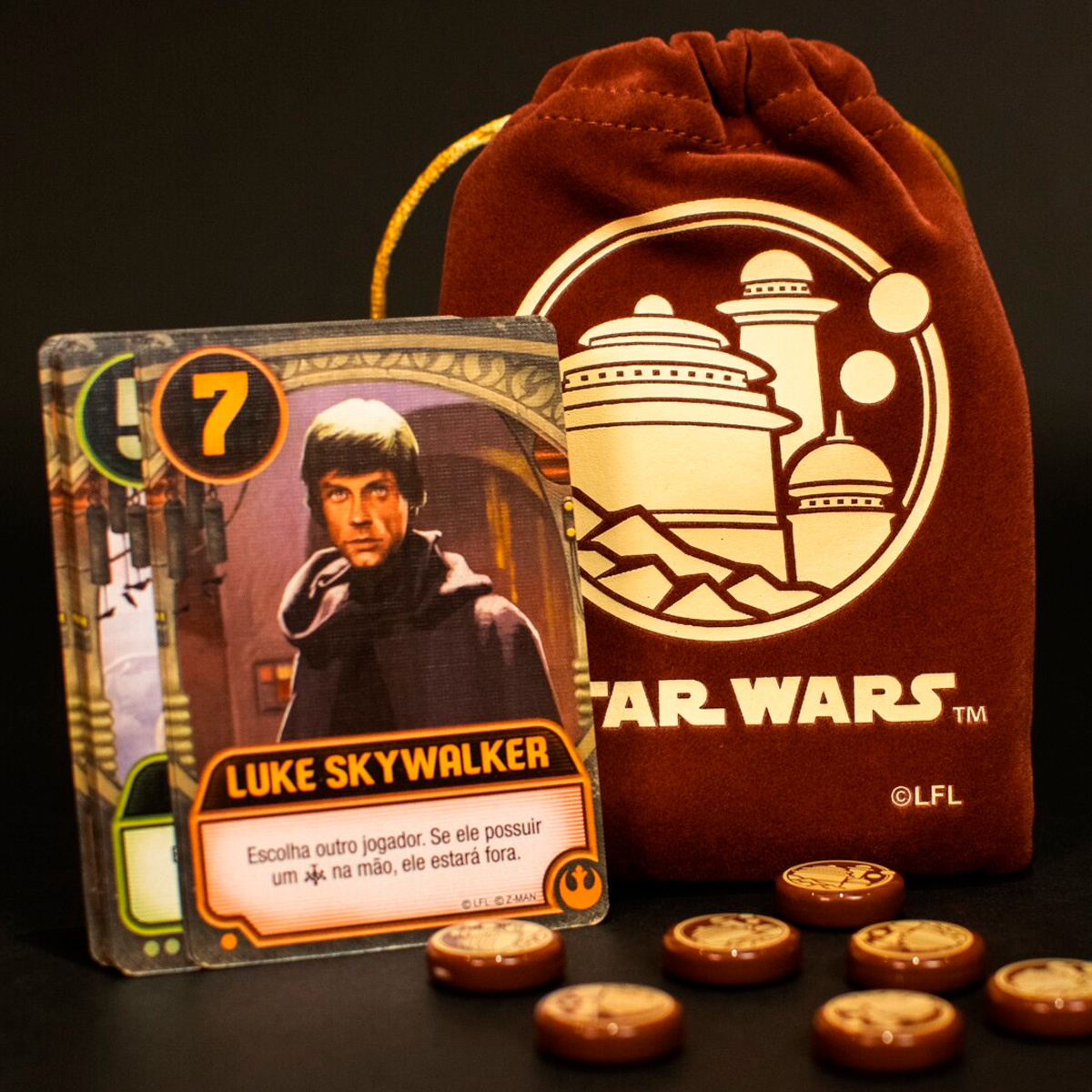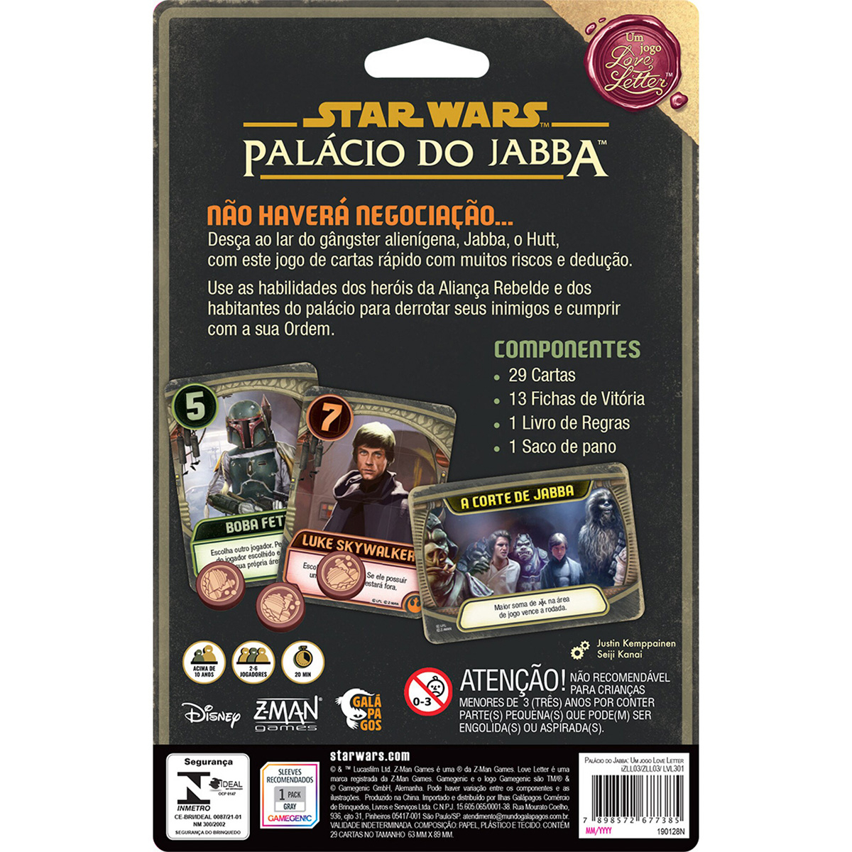 É um jogo baseado no amado jogo de cartas, Love Letter, e ambientado na galáxia da franquia de sucesso, Star Wars. A mecânica é simples e divertida: jogadores compram uma carta em seu turno e usam uma das duas que estão em sua mão. Cada carta tem seu efeito próprio, conforme você utiliza os talentos de personagens icônicos de Star Wars VI - O Retorno do Jedi.