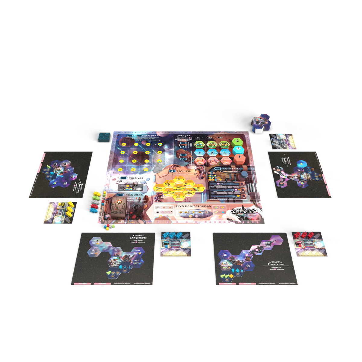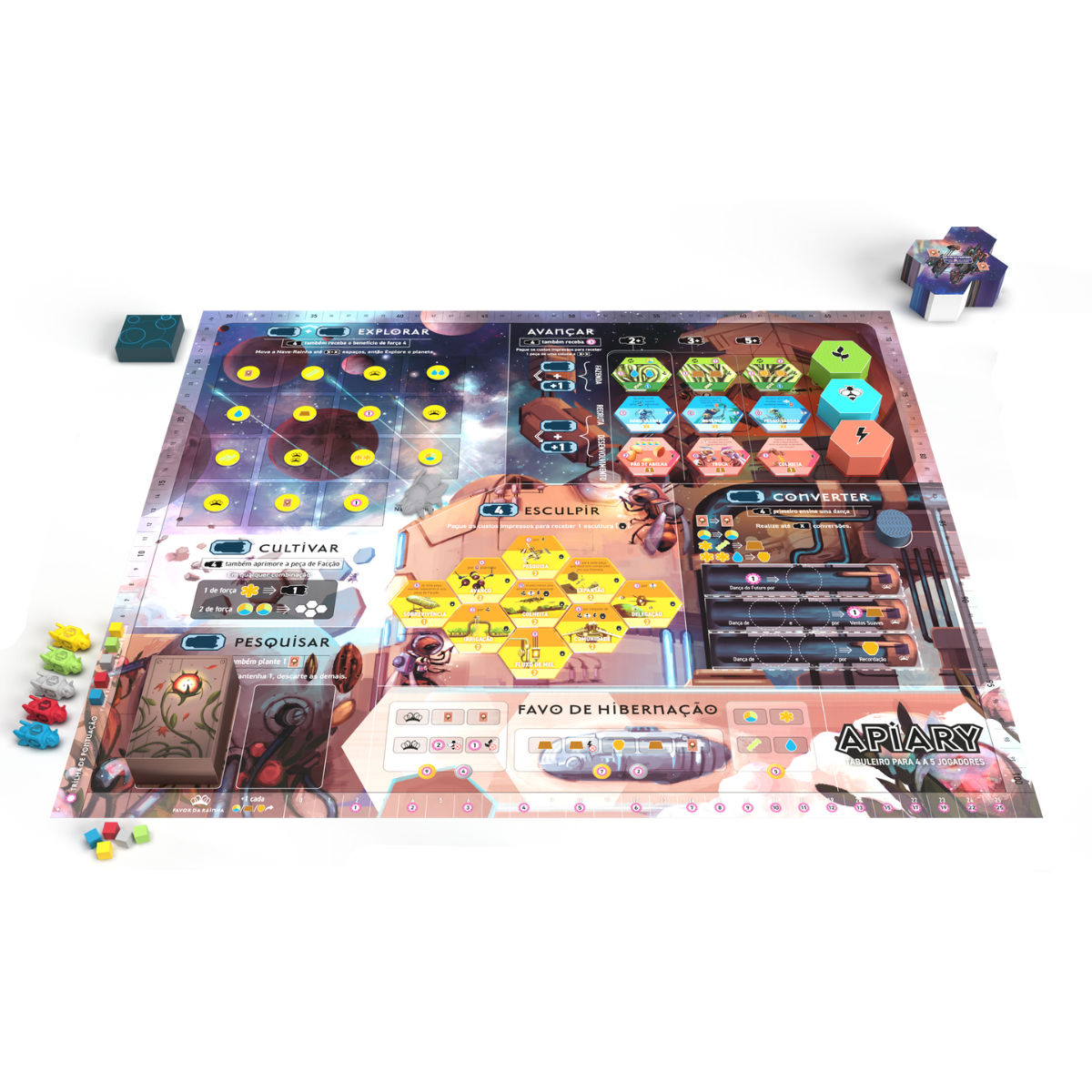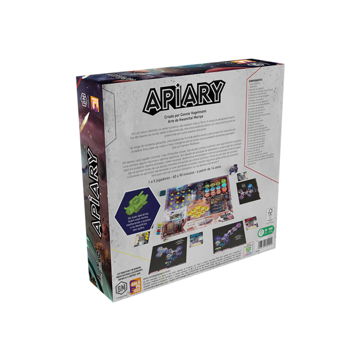 Em Apiary, cada jogador controla 1 das 20 facções únicas. Sua facção começa a partida com suprimentos escassos: uma colmeia, alguns recursos e abelhas operárias. Um desafio de alocação de operárias e construção de colmeias está à sua espera: explore planetas, colete recursos, desenvolva tecnologias e crie esculturas para mostrar quais são os pontos fortes da sua facção.