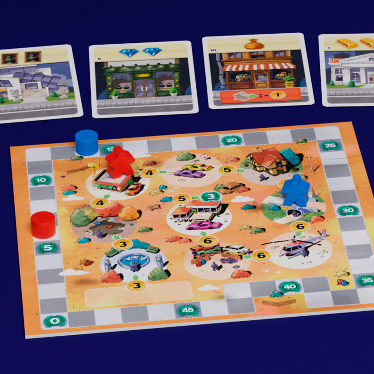Com os roubos realizados, as pessoas reúnem não só dinheiro, mas também diamantes e outros objetos de valor a partir de uma mecânica de Set Collection – aquela que tiver mais coletas de um determinado recurso será a portadora de um dos colares do jogo, que gera pontos de vitória e benefícios. A partida termina quando um jogador completa seu 6º assalto, ou quando qualquer carro chega ao cais na pista da cidade e o jogador com mais pontos vence!