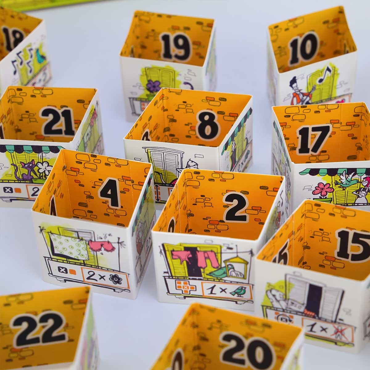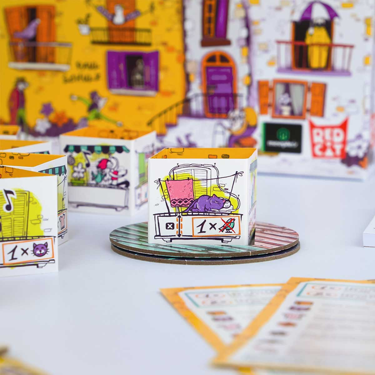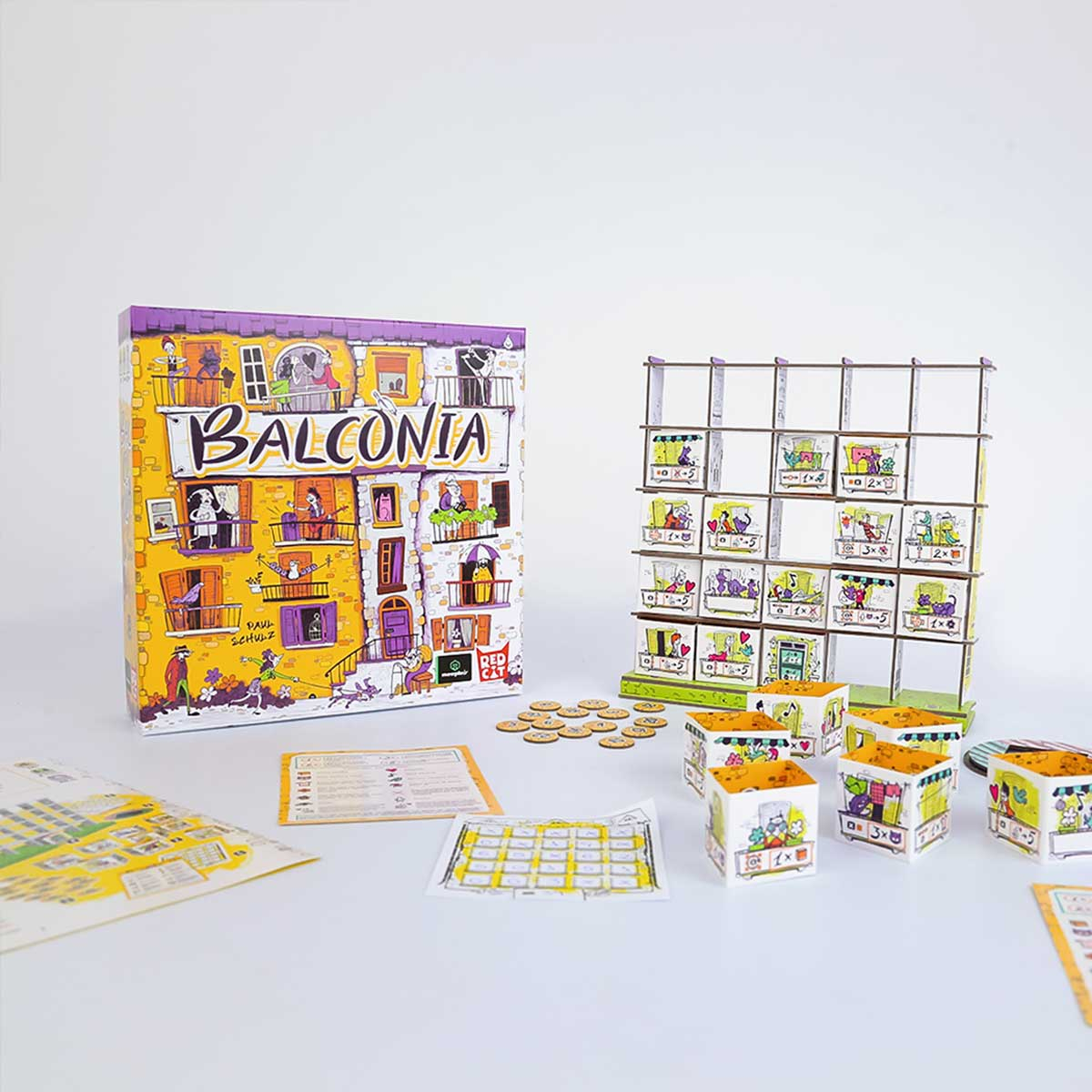 Balconia é um jogo tático leve para 2 jogadores, com componentes 3D diferenciados. Você vai construir um prédio, no qual o objetivo é criar harmonia entre os condôminos, considerando que cada um deles possui objetivos diferentes. O jogo se desenvolve verticalmente, com a inserção dos blocos na arquitetura do edifício. À medida que um dos jogadores inclui novos blocos nos espaços vazios, será preciso entender quais objetivos podem ou não ser atingidos, dependendo das escolhas do outro jogador.