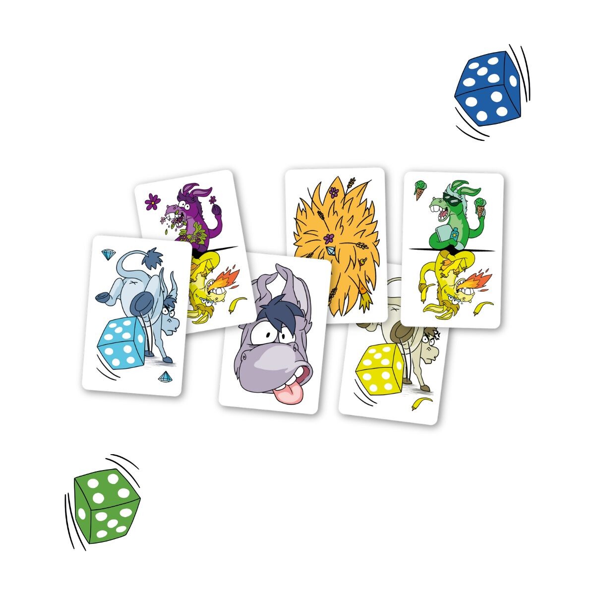 Role os dados e decida como posicioná-los. Depois, escolha com cuidado qual carta jogar – se escolher mal, pode acabar com a maior carta da rodada e quem terminar com ela leva o título de Burrão!