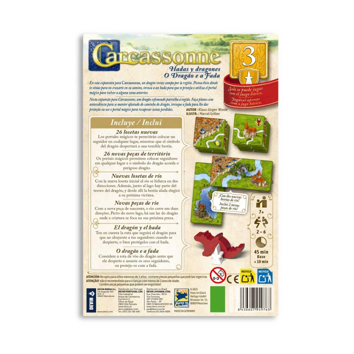 Carcassonne: O Dragão e a Fada inclui 26 novas peças adicionadas ao conjunto principal do jogo. Essas novas peças apresentam portais mágicos, que permitem colocar um seguidor em qualquer lugar, além de símbolos de dragão, que despertam uma fera assustadora que se move pelas peças, assustando os seguidores dos jogadores.