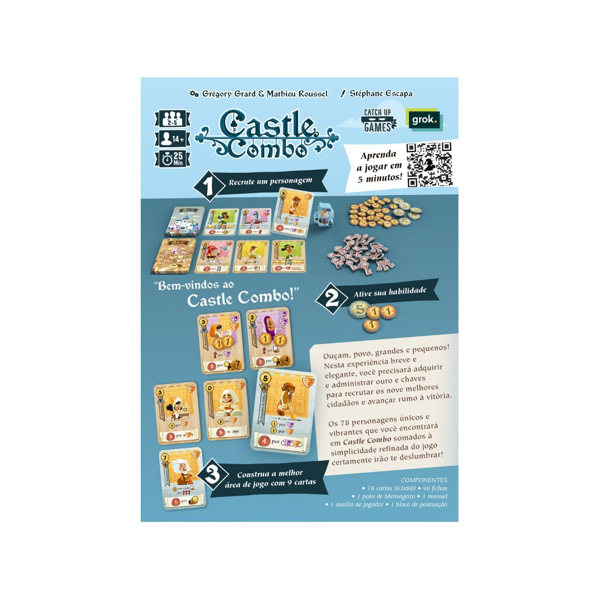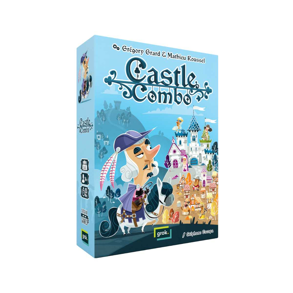 No Castle Combo, os participantes montam uma grade de 3×3 cartas, adquirindo personagens do Castelo ou da Aldeia conforme o movimento do Mensageiro. Cada carta possui um custo em Ouro, oferece habilidades, descontos e condições de pontuação, exigindo planejamento para criar combinações eficientes ao longo de nove rodadas. A ambientação apresenta um reino formado por nobres, artesãos, soldados, religiosos e camponeses, retratados em um clima medieval leve e colorido. As ilustrações transmitem uma atmosfera descontraída que destaca alianças e rivalidades entre os personagens.