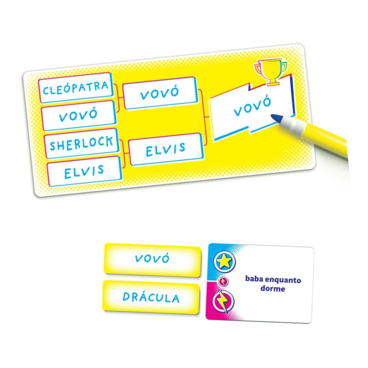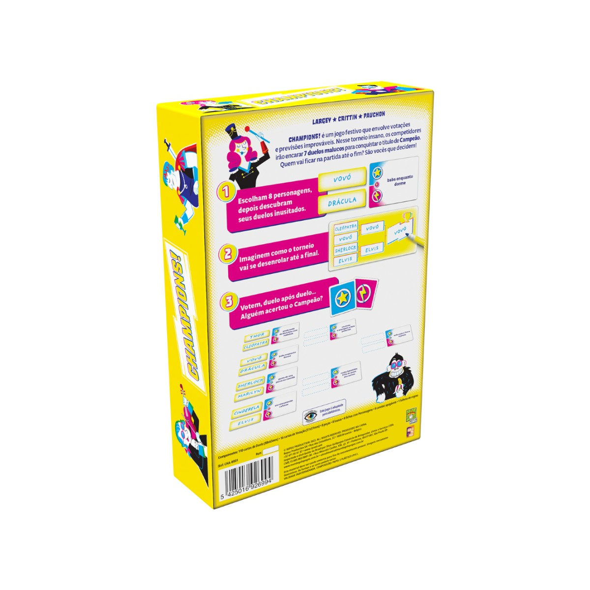 Champions! é um party game de votação baseado em disputas divertidas e inusitadas. Você e seus amigos escolhem 8 Competidores (que podem ser personagens famosos, celebridades e até mesmo o nome de alguém ao redor da mesa!) que se enfrentarão em uma série de Duelos com perguntas capciosas.