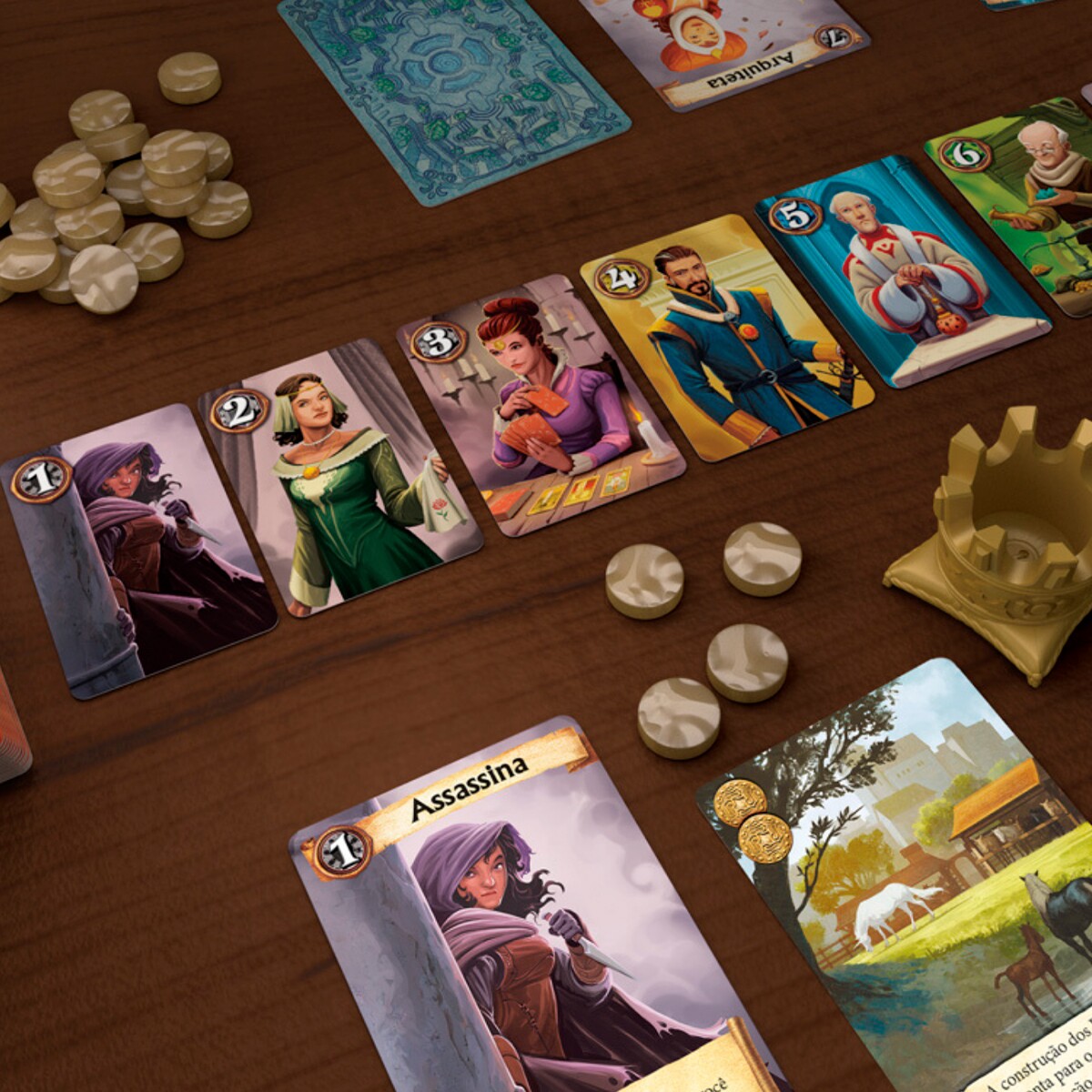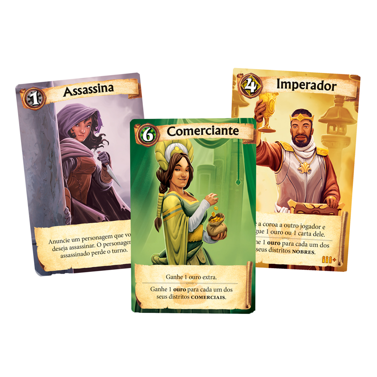 Cada uma destas cores de distrito interage com personagens como o Rei, o Imperador, o Comerciante, o Bispo, e o Mercenário! Os distritos roxos completam a cidade trazendo poderes especiais.