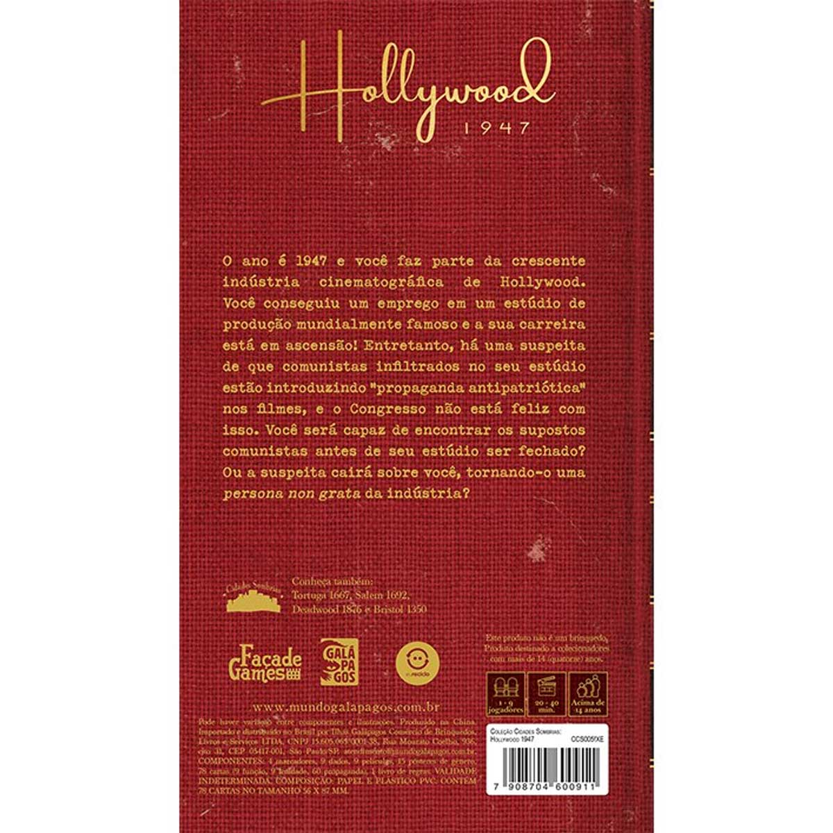 Você conseguiu um emprego em um dos estúdios mais renomados do mundo, mas a glória vem acompanhada de perigos ocultos. Rumores de que comunistas infiltrados estão inserindo "propaganda antipatriótica" nos filmes espalham tensão pelos corredores do estúdio, e o Congresso está de olho. Em Hollywood 1947, parte da Coleção Cidades Sombrias, você terá que usar toda a sua astúcia para identificar os supostos infiltrados antes que seu estúdio seja fechado. Mas cuidado!