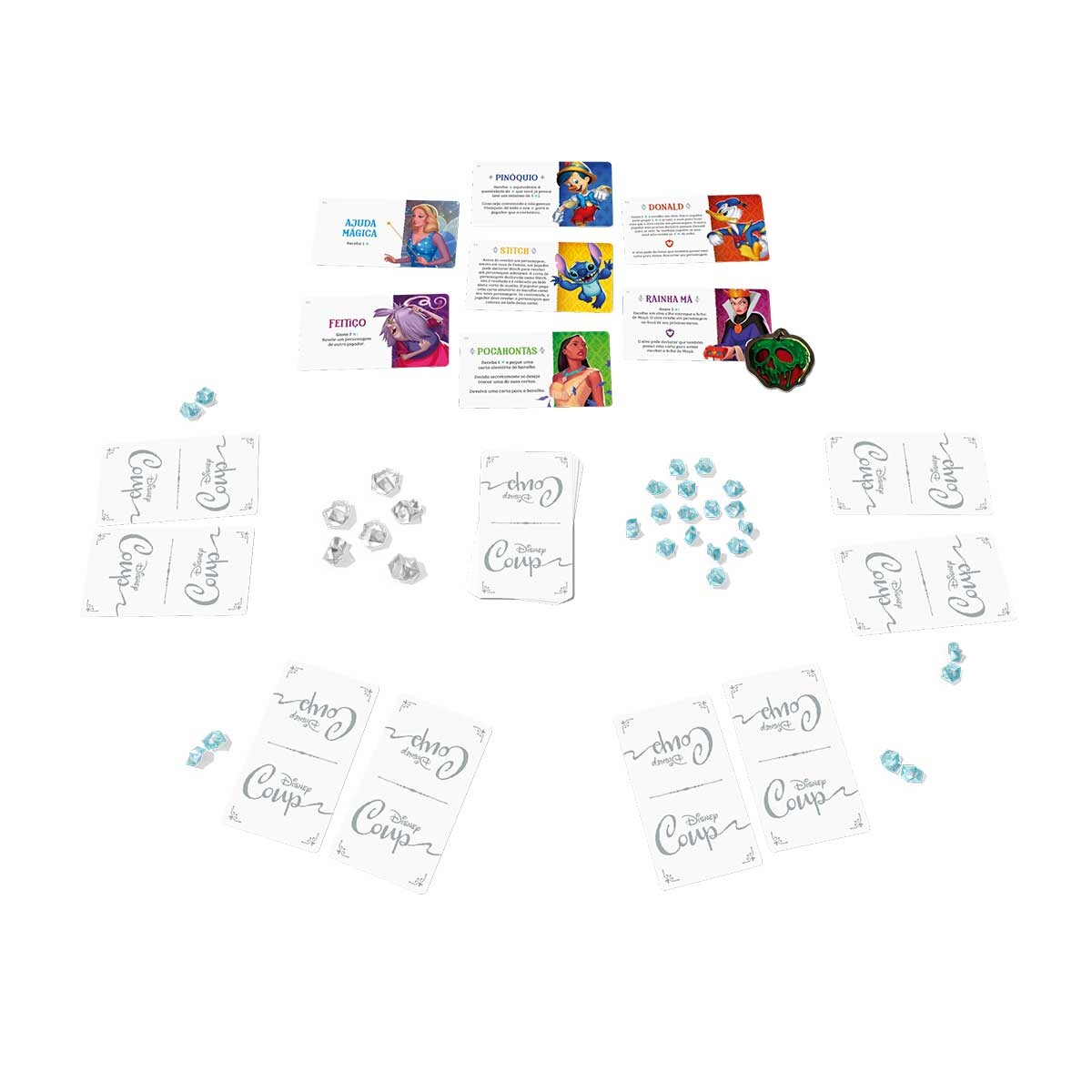 Em Disney Coup, a influência e o blefe são a chave da vitória. Neste jogo, sua influência é representada por cartas viradas para baixo em sua área de jogo. Em seu turno, você poderá utilizar a ação de um dos personagens em suas influências ou blefar, utilizando a ação de um personagem que não está com você. Escolha com sabedoria, pois aqueles que são desmascarados devem perder uma de suas influências. E jogadores sem influência alguma são banidos do reino e da partida. Apenas o último a restar em jogo será o vencedor!