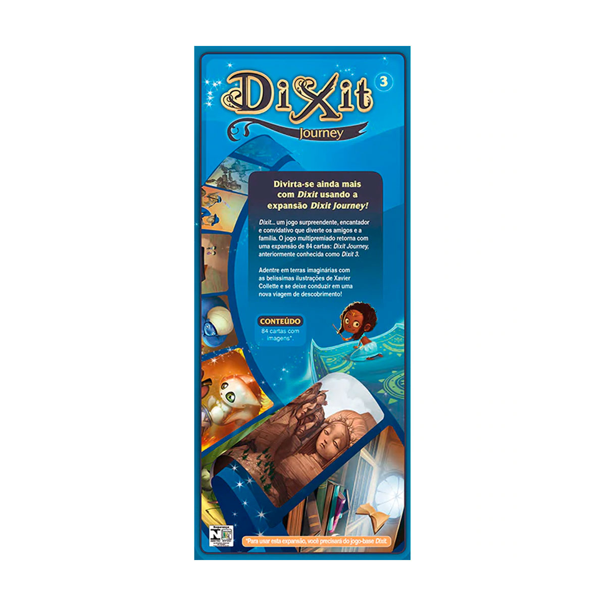A expansão Dixit Journey oferece 84 novas cartas com ilustrações inéditas para o jogo Dixit, todas com a arte de Xavier Collette.
