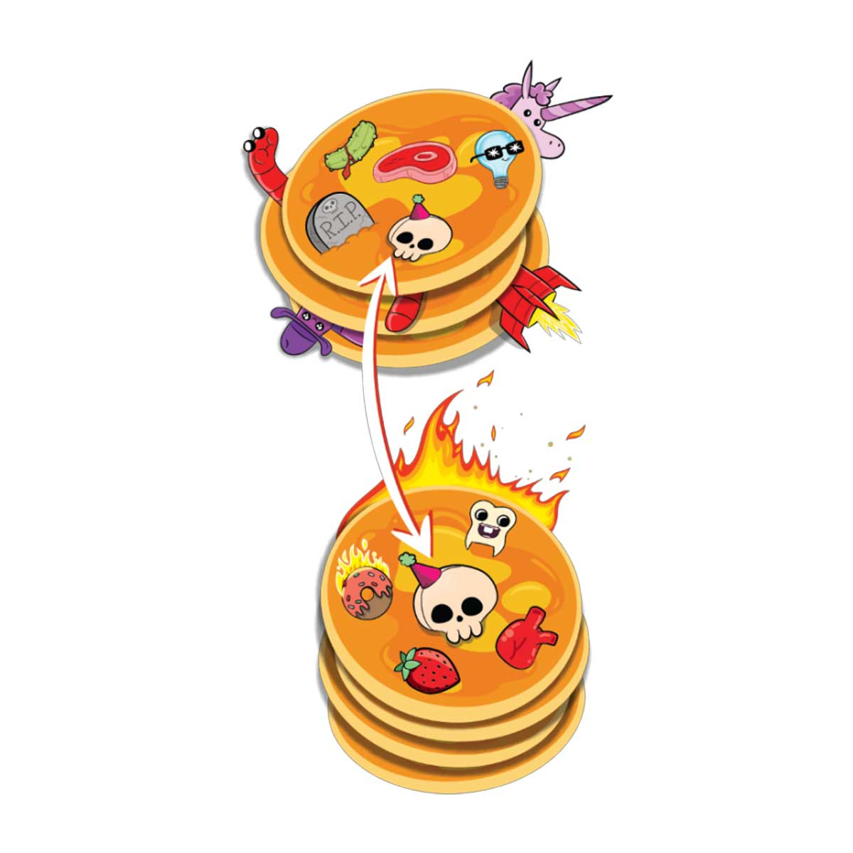 Cada jogador recebe cartas coloridas com diferentes toppings, e o desafio é combinar essas coberturas com as dos outros jogadores para obrigá-los a pegar suas cartas. Quanto menos cartas você tiver, mais difícil será encontrar combinações! Jogado em tempo real, o primeiro a se livrar de todas as suas panquecas ganha a rodada e um "tablete de manteiga".
