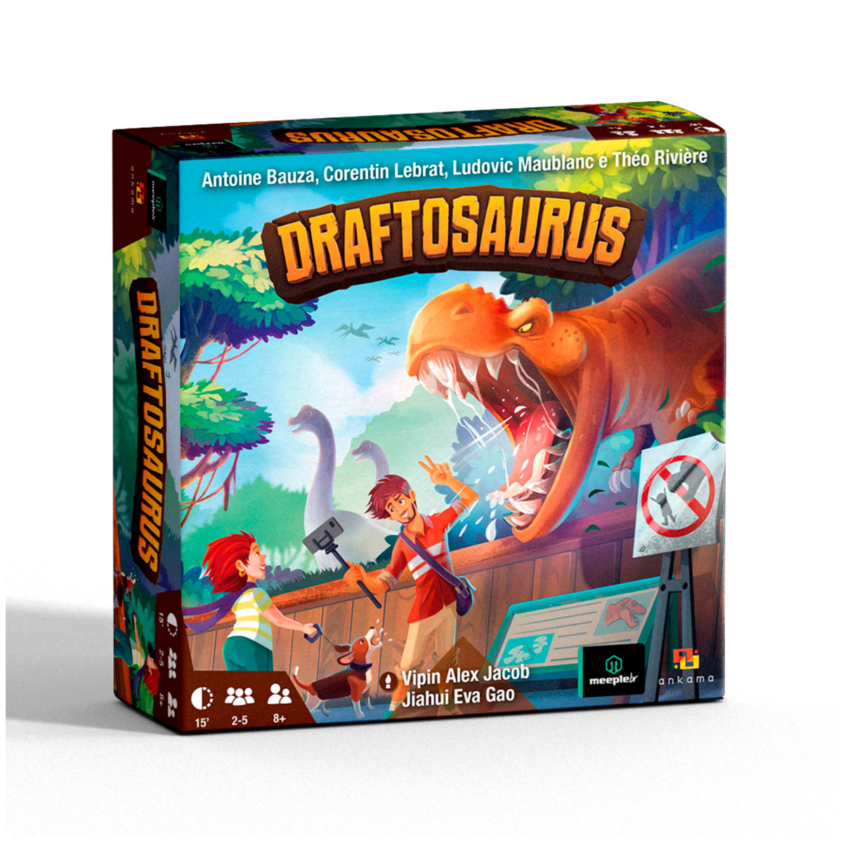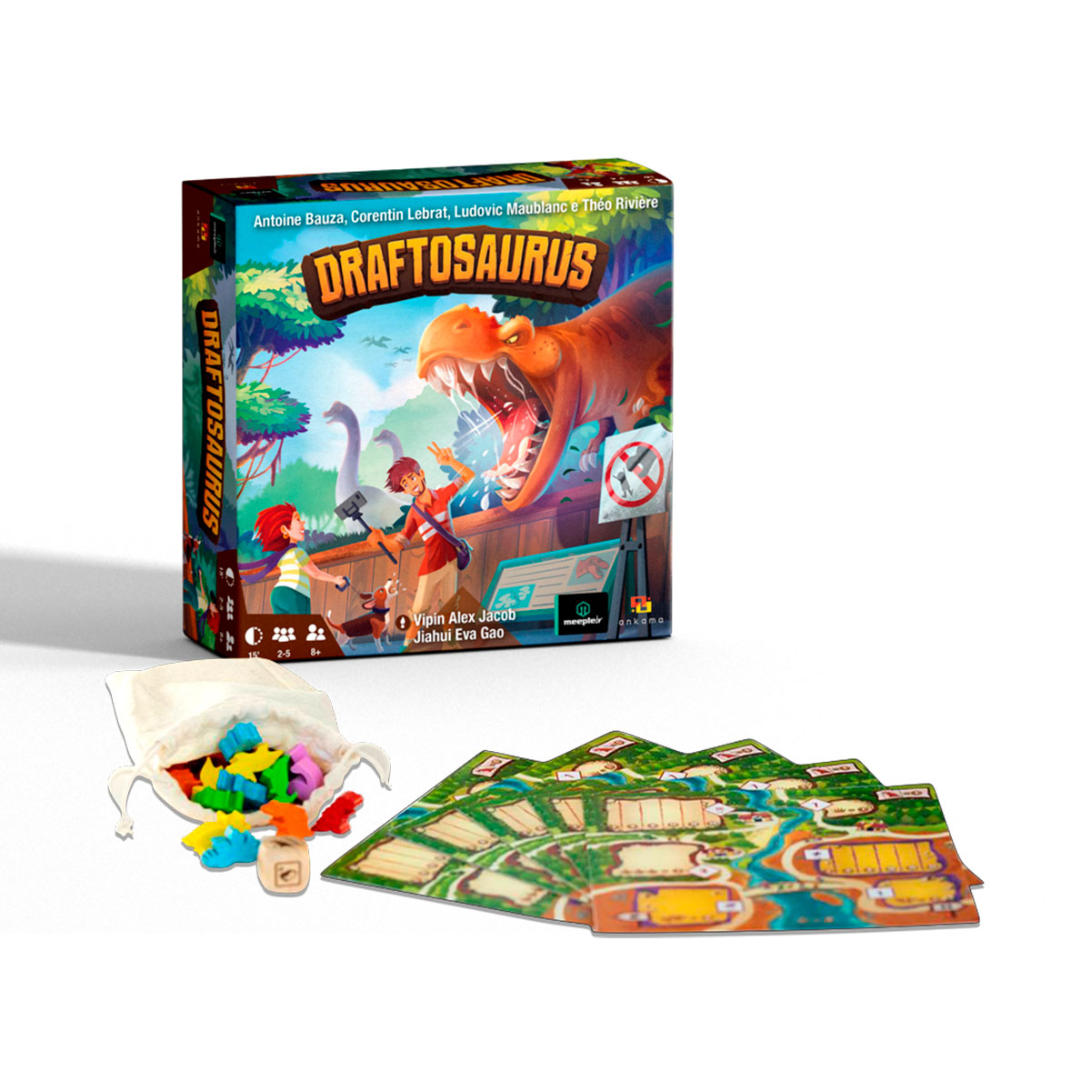 Seu objetivo em Draftosaurus é ter o parque Dino com maior probabilidade de atrair visitantes. Para fazer isso, você deve comprar dino meeples e colocá-los em lugares que tenham algumas restrições de posicionamento. Cada turno, um dos jogadores lança um dado e isso adiciona uma restrição a qual espaço qualquer outro jogador pode adicionar seu dinossauro.