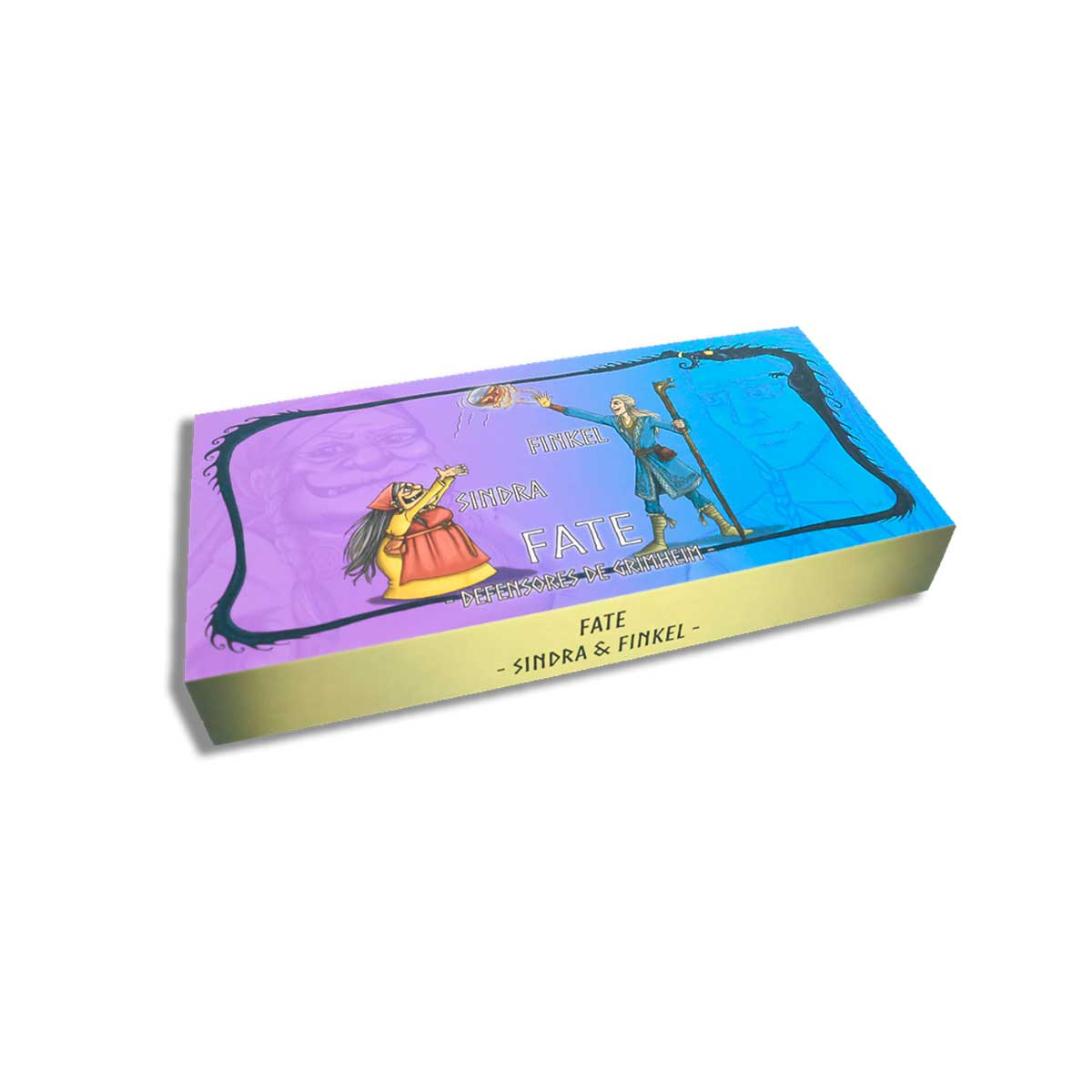 Uma caixa extra de expansão do jogo Fate: Defensores de Grimheim com dois personagens: Sindra e Finkel.