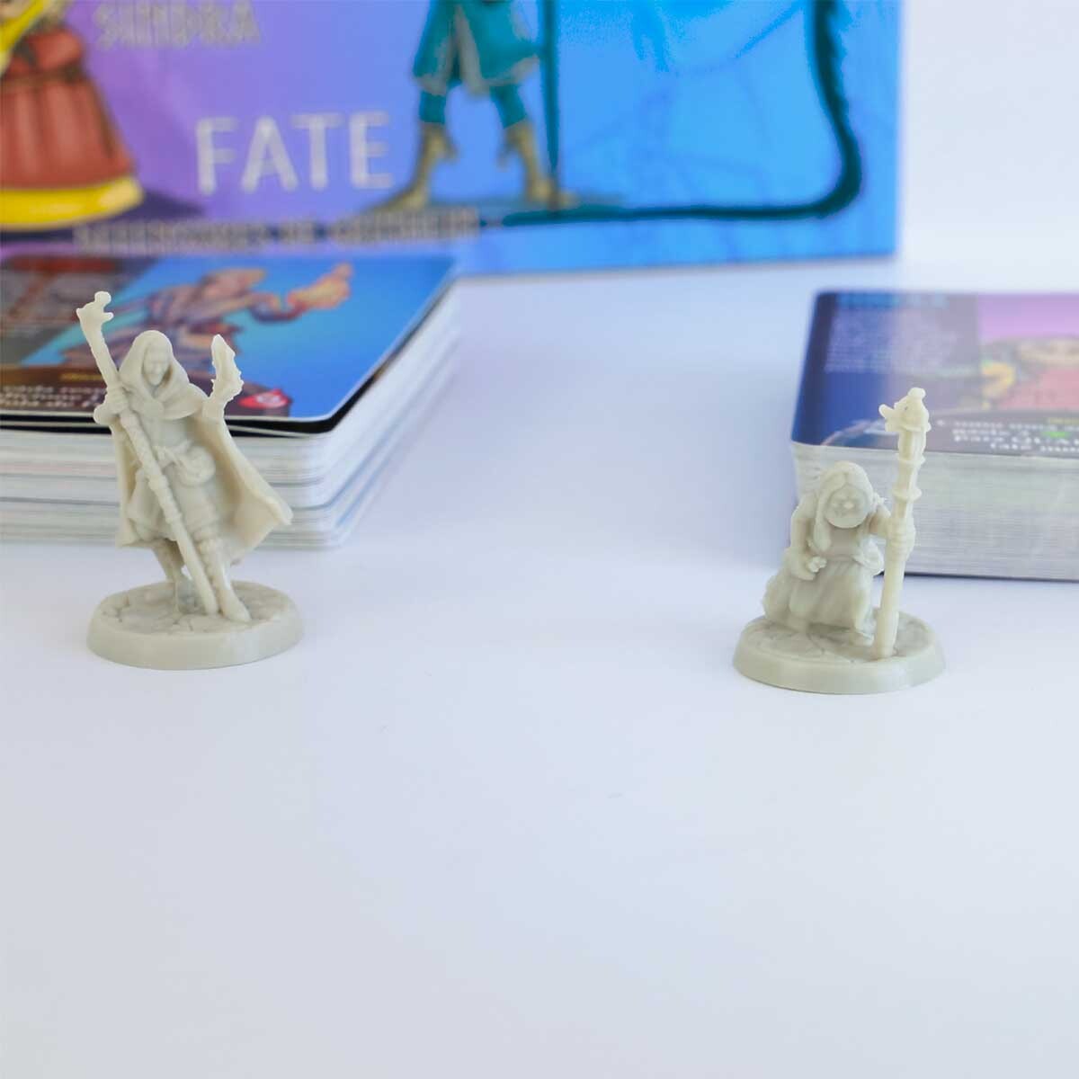 A caixa contém duas miniaturas dos personagens e 40 cartas para cada um deles, sendo 80 cartas ao todo.