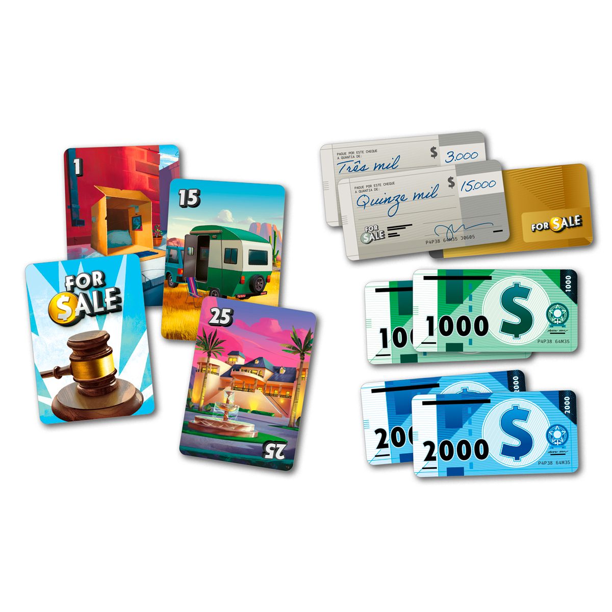Dou-lhe uma! Dou-lhe duas! Vendido ao maior ofertante!Dê lances e blefe à vontade para adquirir os imóveis mais valiosos pelo menor preço, depois venda essas propriedades por gordos cheques.For Sale é um jogo rápido e divertido de compra e venda de propriedades onde os jogadores são forçados a tomarem decisões difíceis a todo minuto.Construa sua fortuna no setor imobiliário e torne-se um magnata ao final da partida neste clássico do autor Stefan Dorra.