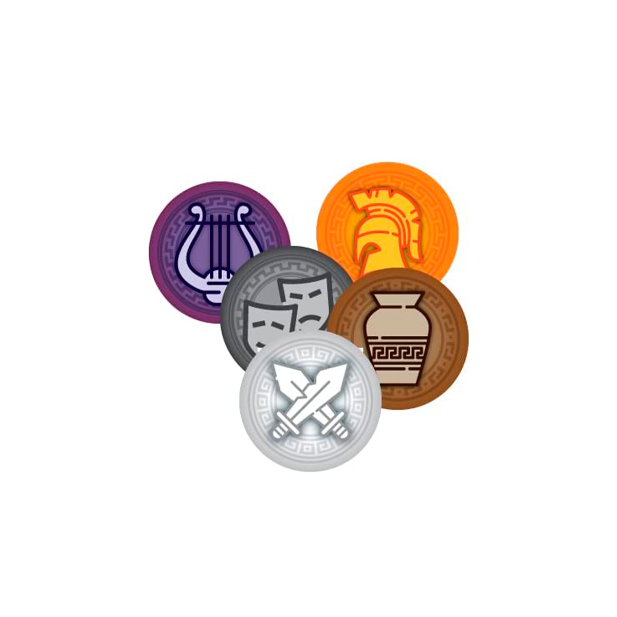 Além disso, os heróis são abençoados pelos deuses com poderes de acordo com sua patronagem: Atena, deusa da sabedoria e da guerra defensiva, concede um reposicionamento estratégico no início do movimento; Hermes, deus das estradas e viagens, oferece uma abertura de caminhos no meio do movimento; e Ares, deus da guerra, é o único que permite aos heróis passarem pelo terrível Minotauro. Cada jogador tem dois heróis devotos a cada um dos deuses e podem, portanto, usar a bênção concedida durante sua fuga. Crie seus caminhos, recolha seus troféus e que os deuses nos ajudem!