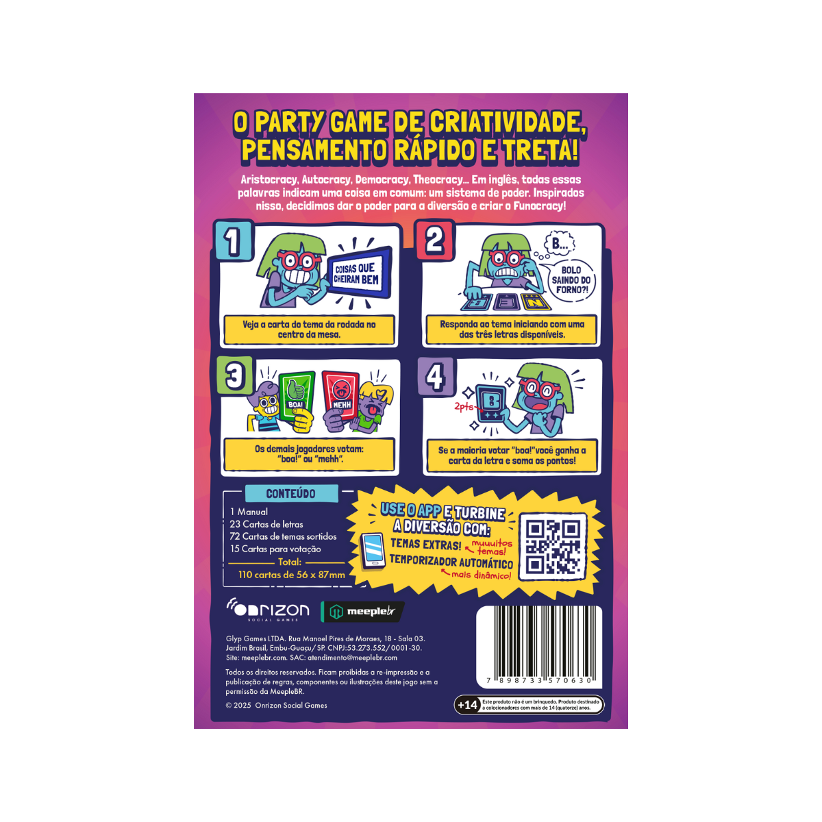 Funocracy é inspirado nos diversos sistemas de poder que moldaram a história, e oferece uma proposta inovadora: democratizar a diversão! Um jogo festivo eletrizante, onde a criatividade e o raciocínio rápido se unem para criar momentos hilários e inesquecíveis.