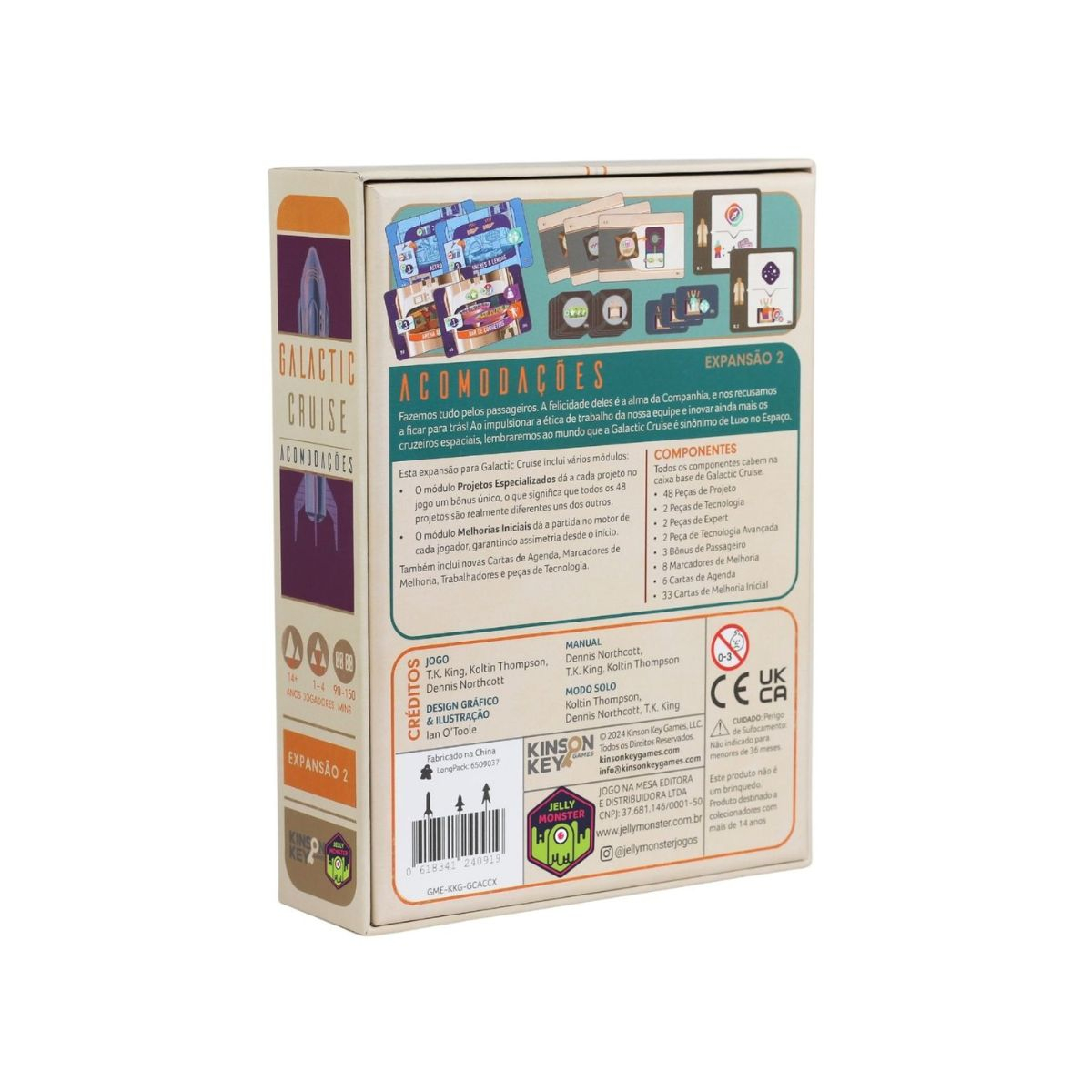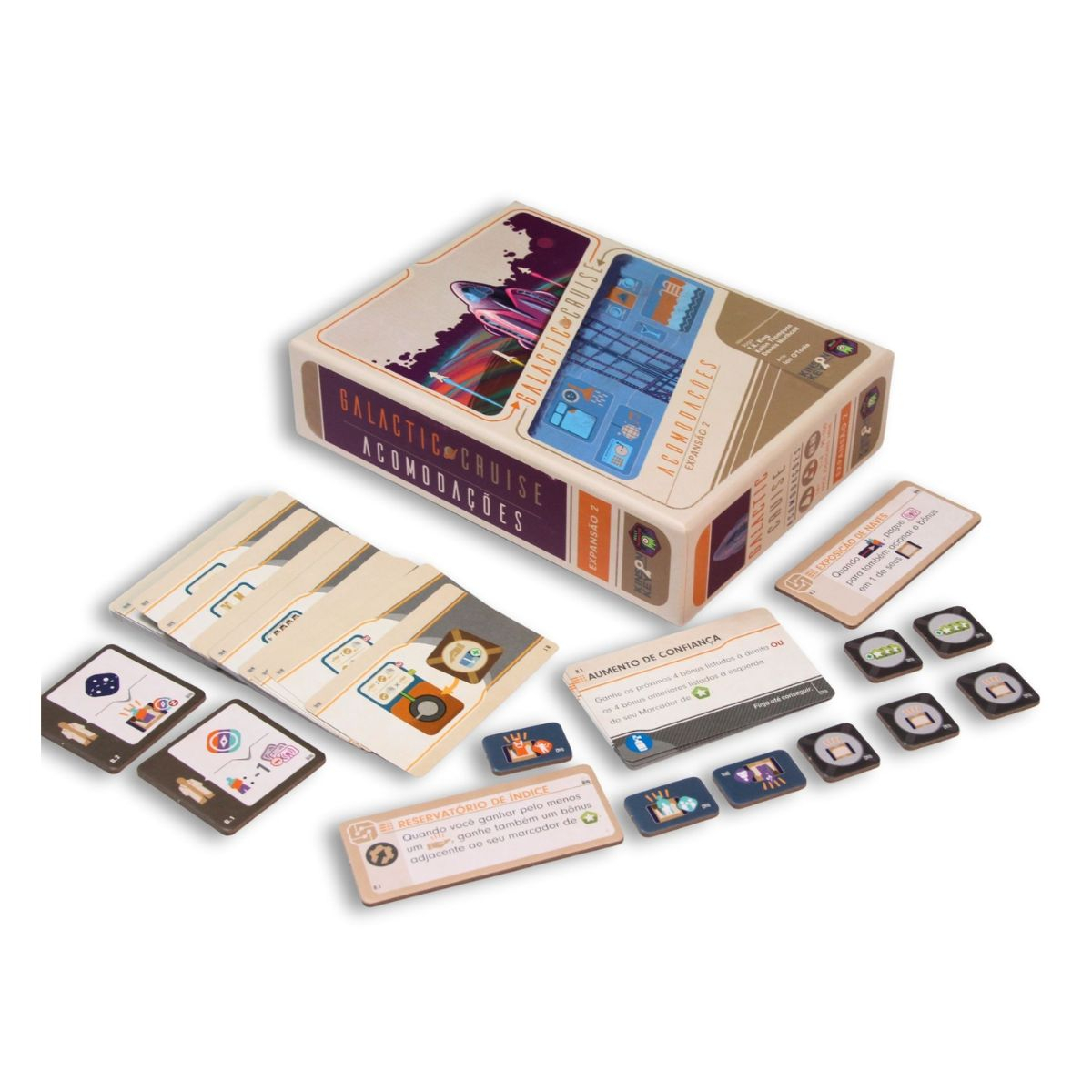 O jogo também inclui novas Cartas de Objetivo, novos Marcadores de Aprimoramento, 2 novas fichas de Trabalhadores Especialistas e 2 novas Tecnologias. Então, o que está esperando? Vamos proporcionar aos nossos hóspedes a melhor viagem de suas vidas!
