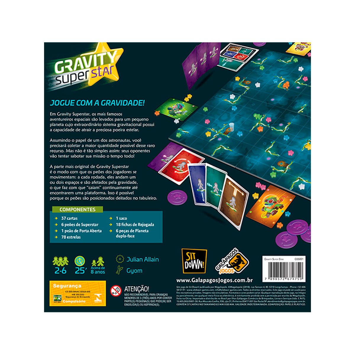 A parte mais original de Gravity Superstar é o modo com que os peões dos jogadores se movimentam: a cada rodada, eles andam um ou dois espaços e são afetados pela gravidade, o que faz com que “caiam” continuamente até encontrarem uma plataforma. Isso é possível porque os peões são posicionados deitados no tabuleiro.