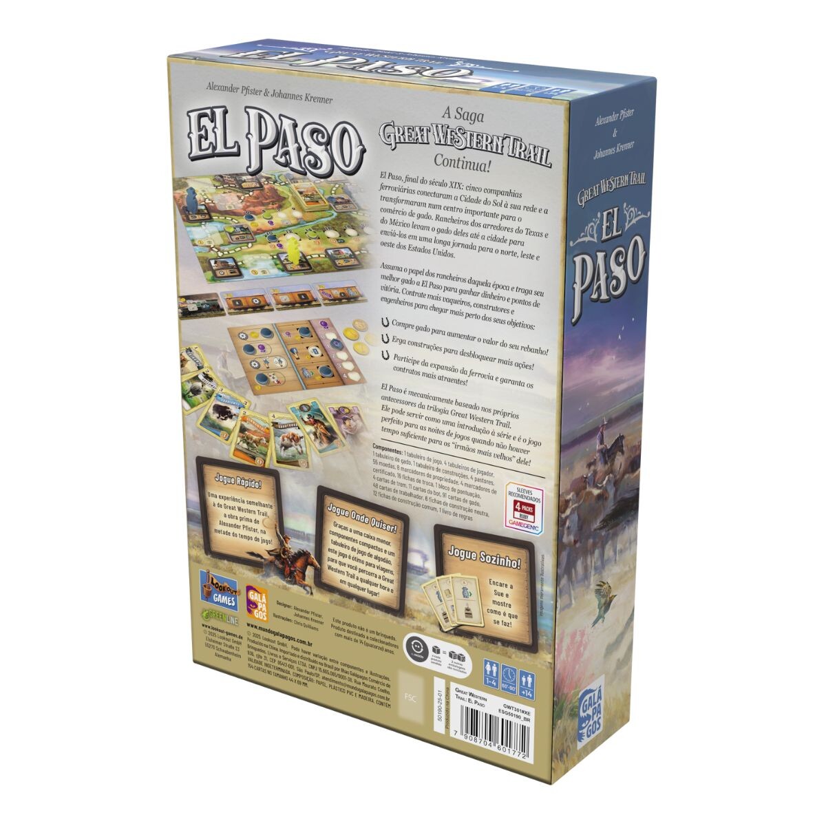 Participe da expansão da ferrovia e garanta os contratos mais atraentes! El Paso é mecanicamente baseado nos próprios antecessores da trilogia Great Western Trail. Ele pode servir como uma introdução à série e é o jogo perfeito para as noites de jogos quando não houver tempo suficiente para os “irmãos mais velhos” dele!