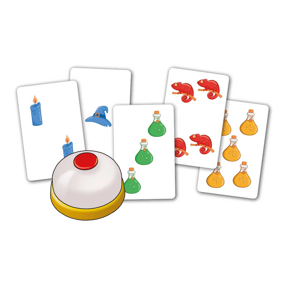 Em Halli Galli Twist, temos uma grande mistura de símbolos mágicos, como velas, chapéus, poções e camaleões, todos em diferentes cores. Os jogadores recebem cartas que mostram esses 4 tipos de símbolos, em grupos de 1 a 5.