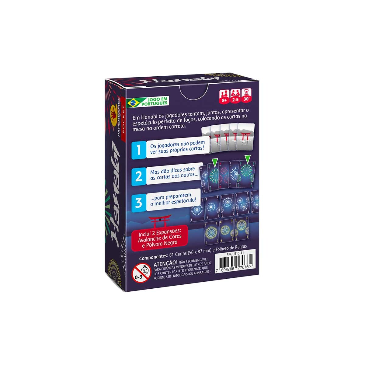 Além da arte totalmente renovada, esta nova edição de Hanabi inclui 2 expansões dentro da caixa: Avalanche de Cores e Pólvora Negra,