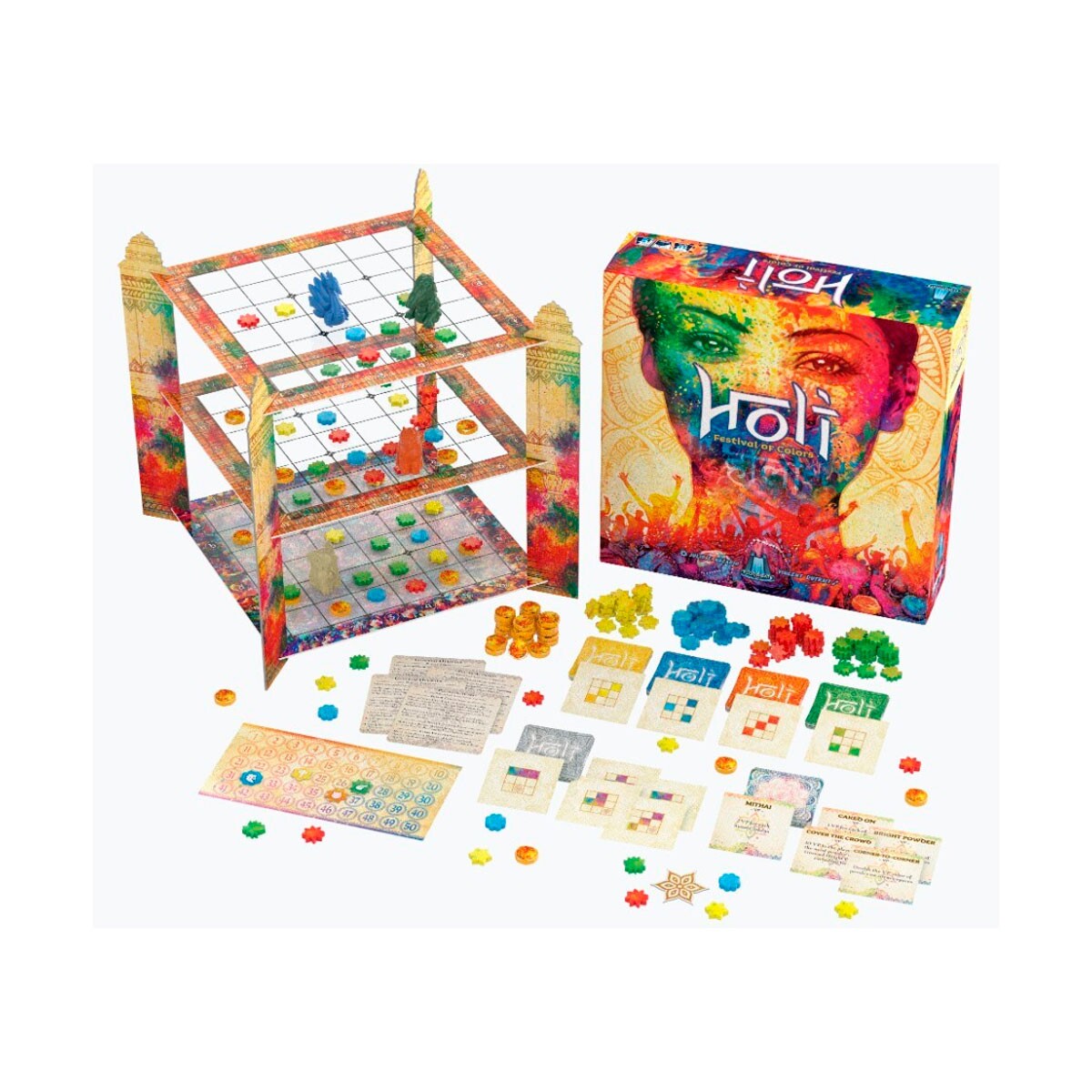 No Holi, os jogadores ganham alegria (pontos) ao arremessarem cor nos tabuleiros (os pisos mais altos valem mais pontos), ao colorirem os outros e ao recolherem guloseimas. O jogador que tiver mais pontos quando mais ninguém puder arremessar cores será o vencedor.