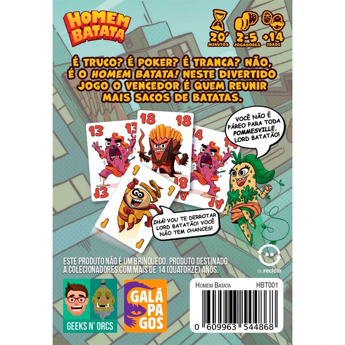 Mas se você está perdendo a rodada, não tema! Pois o Homem Batata, uma das menores batatas nesse baralho, derrota o Lord Batatão – a batata mais forte do baralho! Além disso, o jogo conta com arte e temática cômica, para trazer diversão e leveza (e talvez um pouco de fome) pro seu rolê!