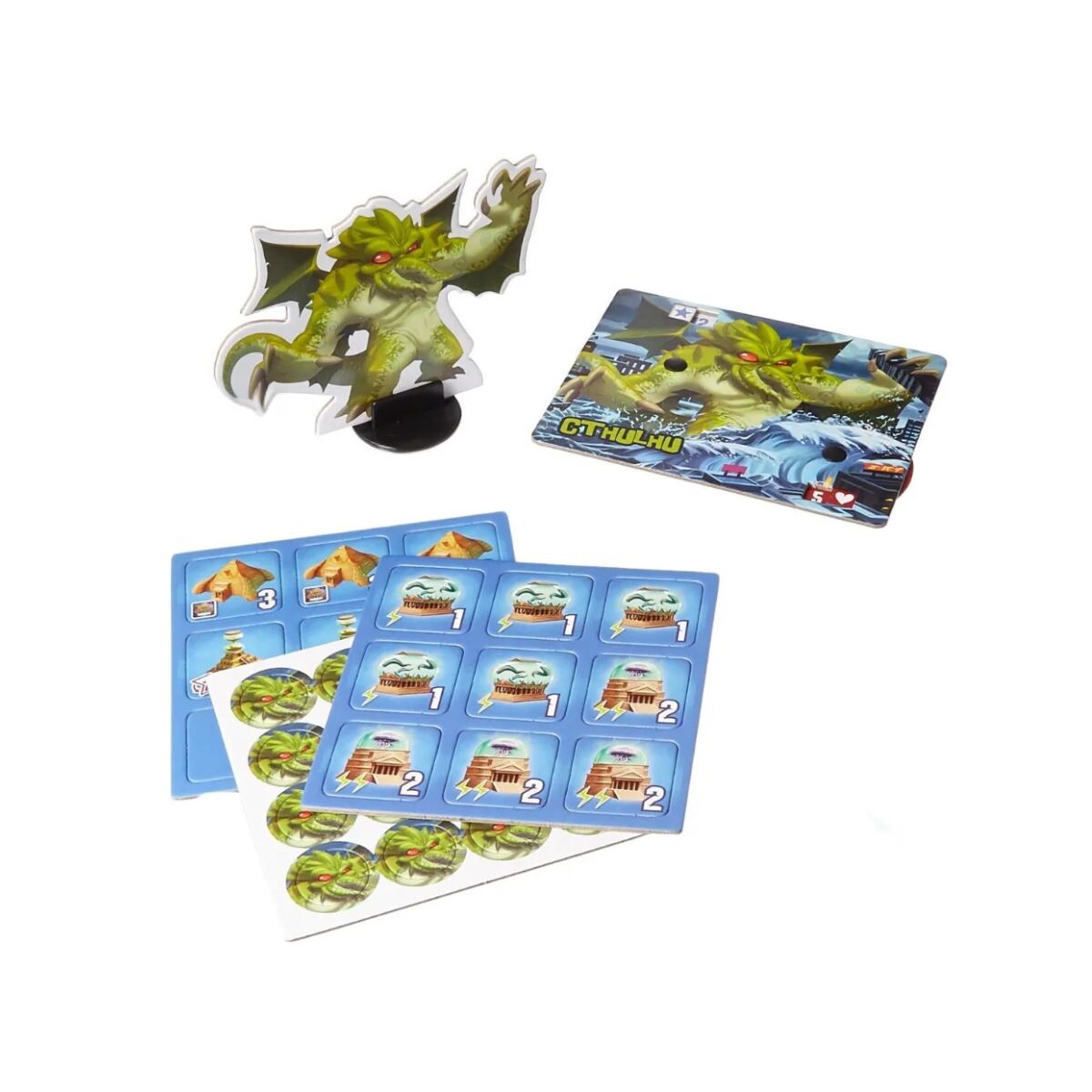 O Monster Pack: Cthulhu inclui um novo monstro, Cthulhu, caso você não tenha adivinhado, além de oito cartas de evolução para usar no King of Tokyo. Você também pode jogar com as peças cultistas, que dão aos jogadores um efeito bônus ao obtê-las! Além de oito cartas de evolução e quinze fichas de cultista (que também são Templo de Cthulhu) . Agora você tem novas unidades e edifícios para lutar! Derrotar um Cultista permite que você obtenha a peça e a use uma vez para ganhar 1 ponto de vida, 1 energia ou 1 rolagem extra!