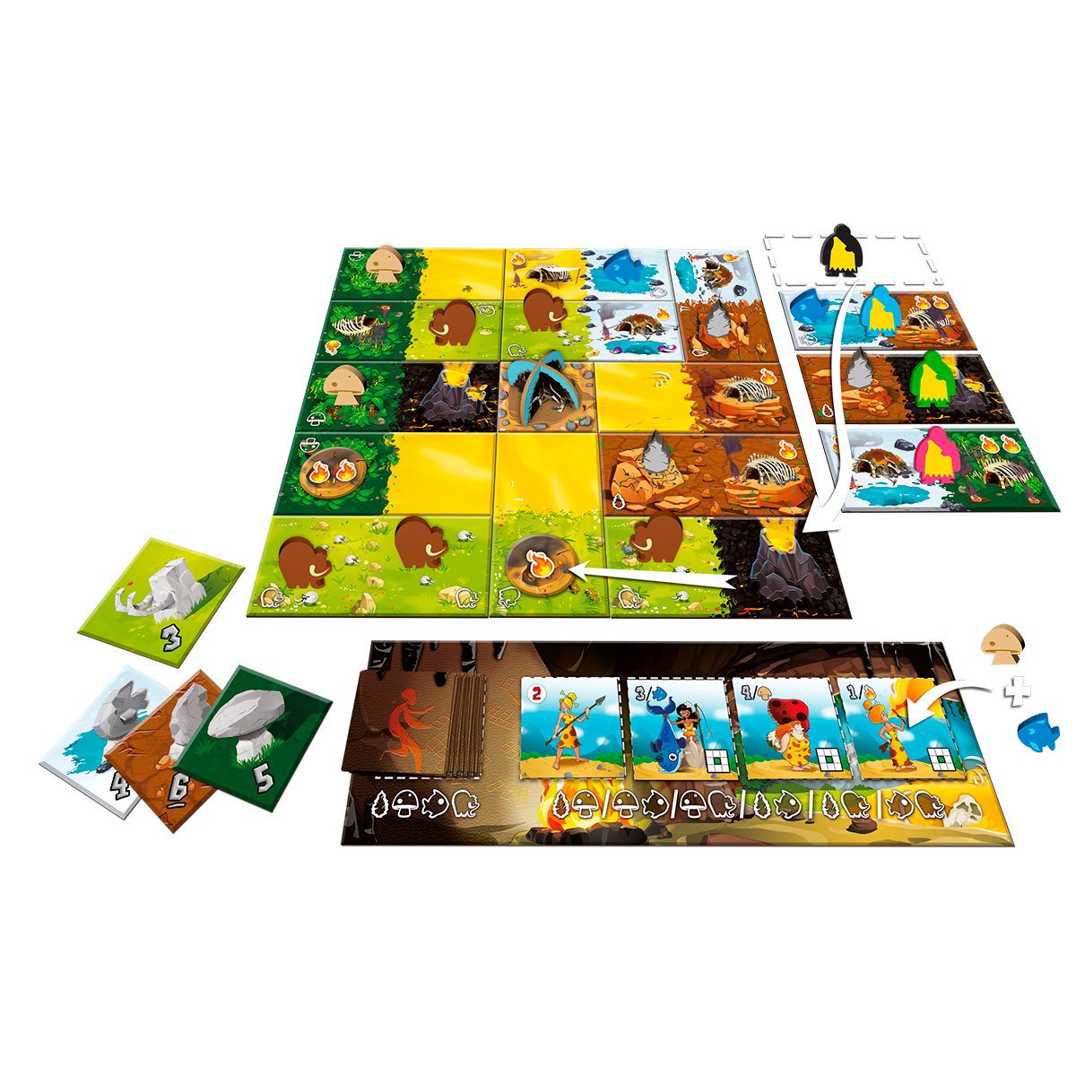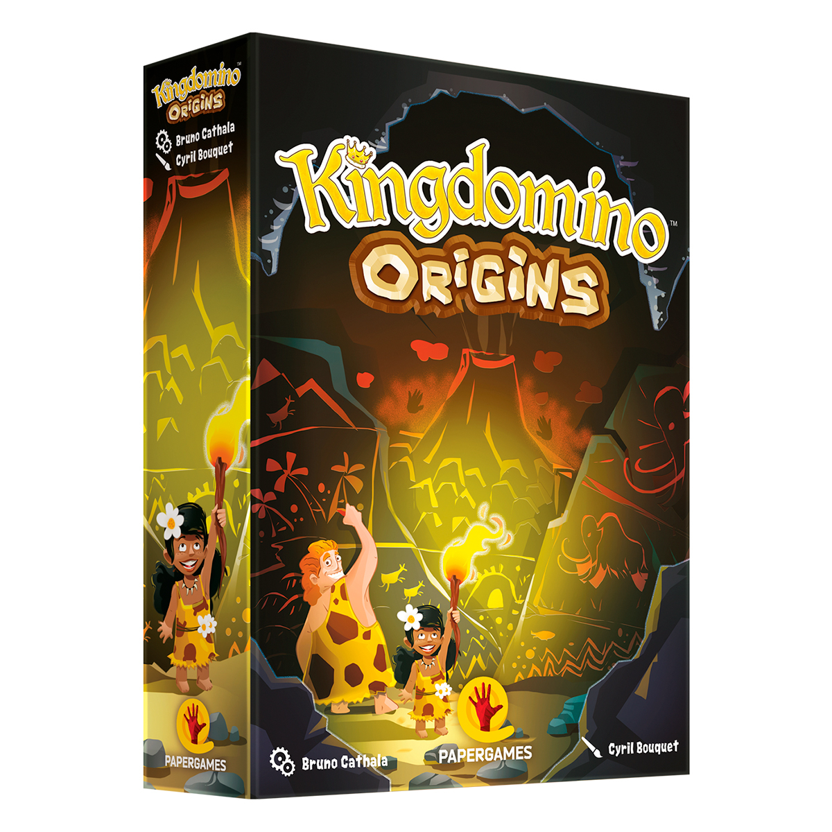 Em Kingdomino Origins, desenvolva sua tribo, levando o fogo a seus vários acampamentos, com ajuda dos terríveis vulcões e suas erupções. Explore recursos naturais: mamutes, peixes, sílex e cogumelos, para recrutar destemidos habitantes das cavernas, aumentando sua tribo e seu território de caça!