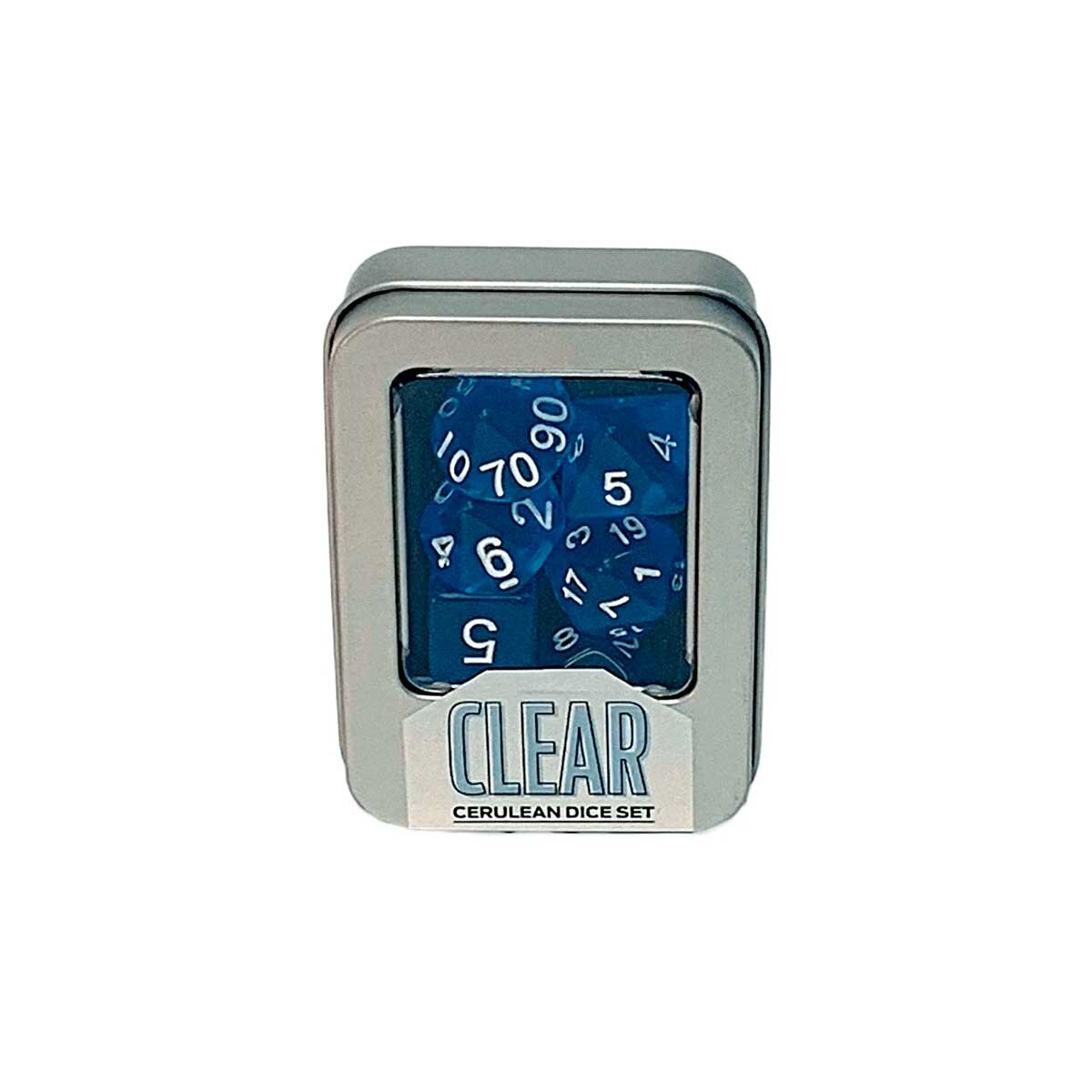 Kit de dados translúcidos da linha CLEAR na cor Cerulean contendo os principais dados para jogar os mais conhecidos sistemas de RPG. São eles: d4, d6, d8, d10, d10 (dezena), d12 e d20.
