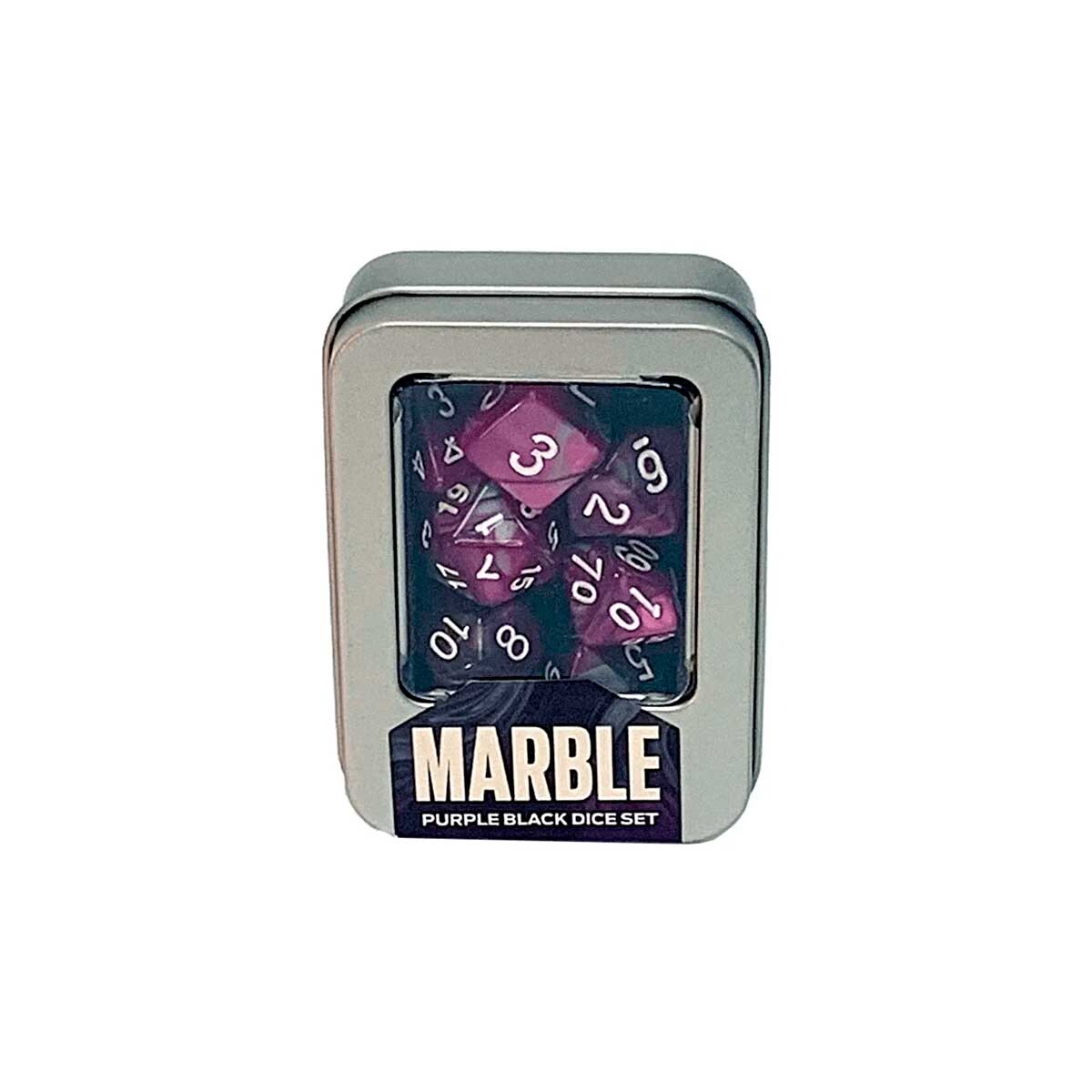 Kit de dados perolados da linha MARBLE na cor Purple Black contendo os principais dados para jogar os mais conhecidos sistemas de RPG. São eles: d4, d6, d8, d10, d10 (dezena), d12 e d20.