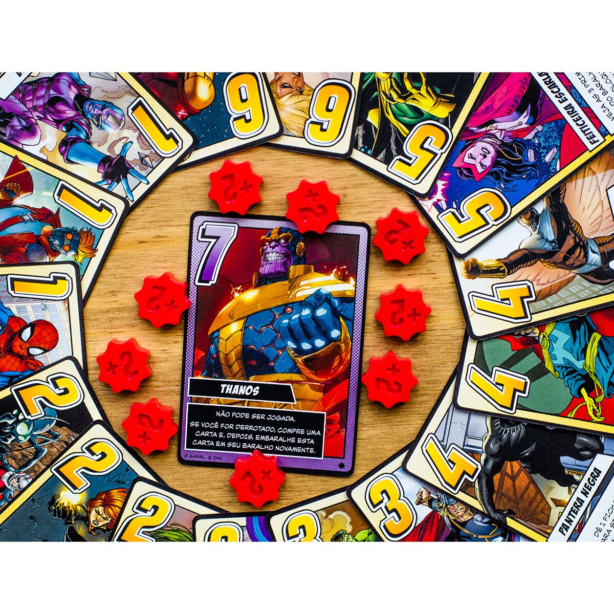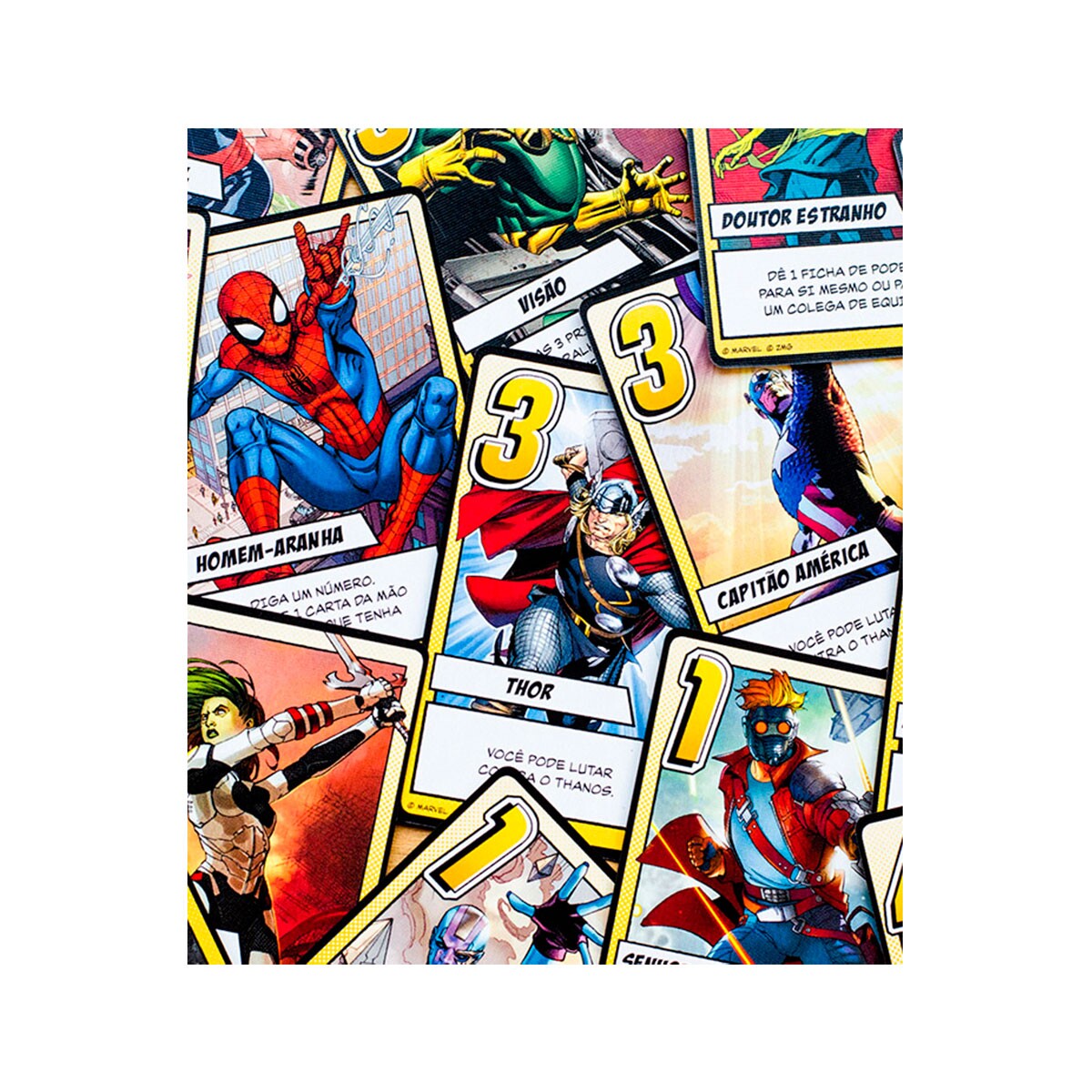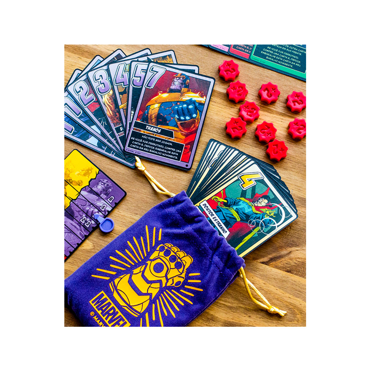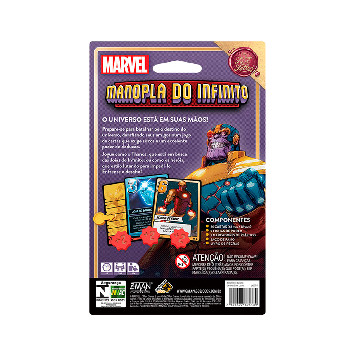 Enquanto isso, de 1 a 5 jogadores reúnem os heróis para lutar contra Thanos, impedir seus planos e salvar o universo! O jogo utiliza a mecânica do clássico Love Letter, sendo que os participantes devem usar cartas que representam heróis,vilões e as Joias do Infinito em uma batalha pelo destino do Universo.