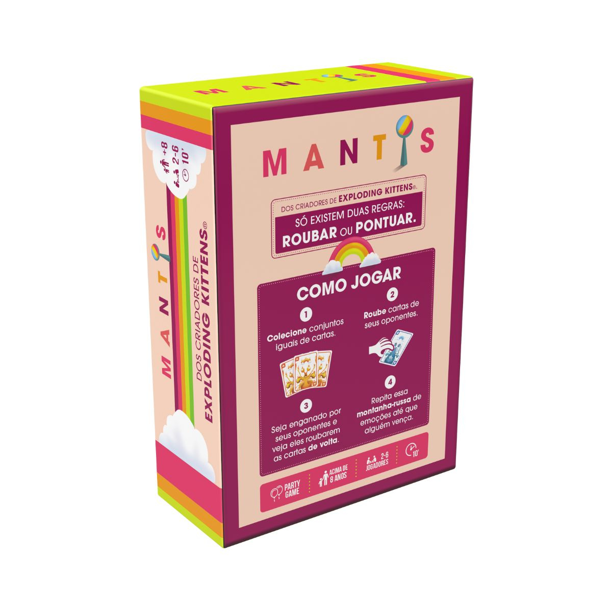 Mantis tem apenas duas regras: Roube ou Marque seu caminho para a vitória. Colete cartas iguais roubando ou pontuando até que o vencedor tenha 10 cartas em sua pilha de pontuação.