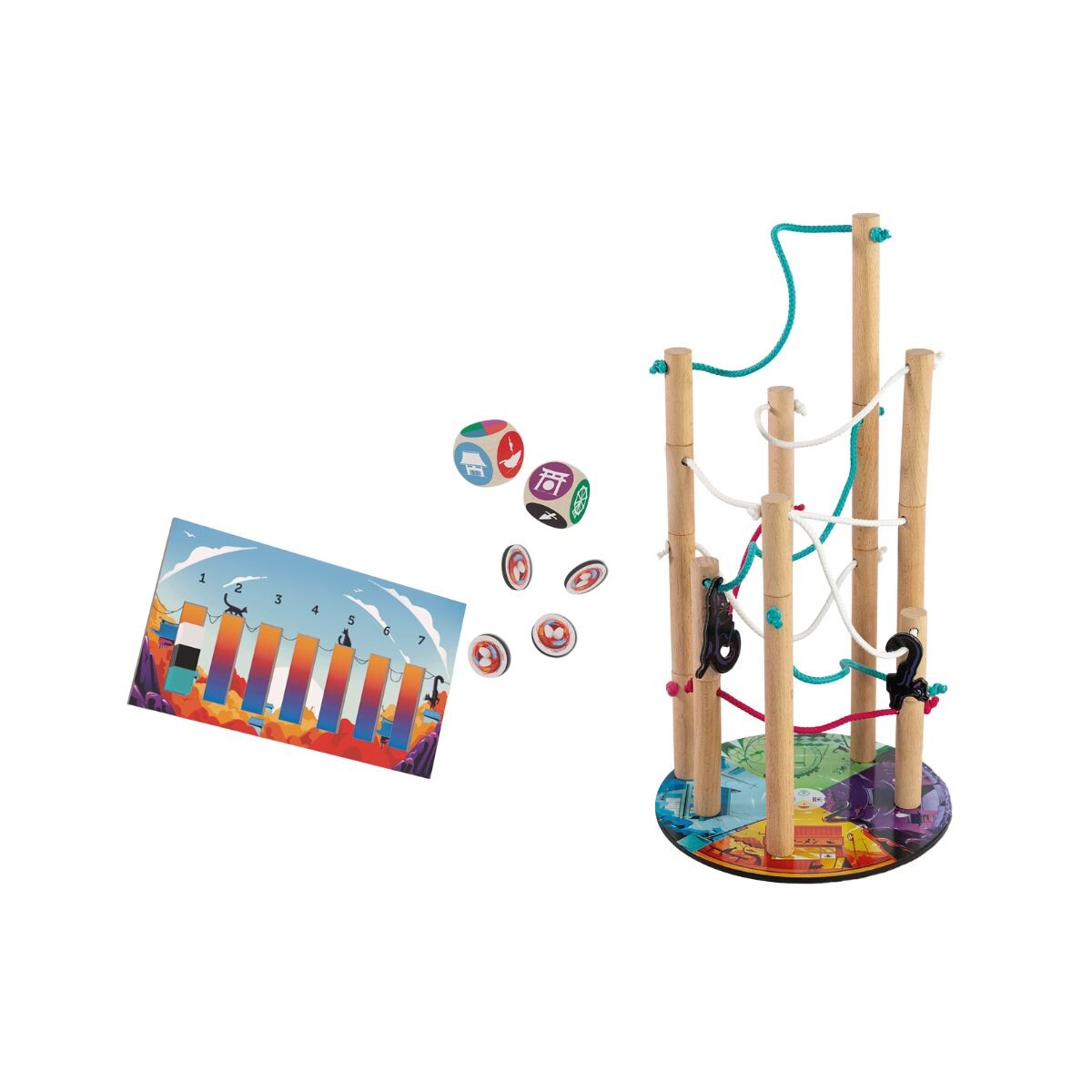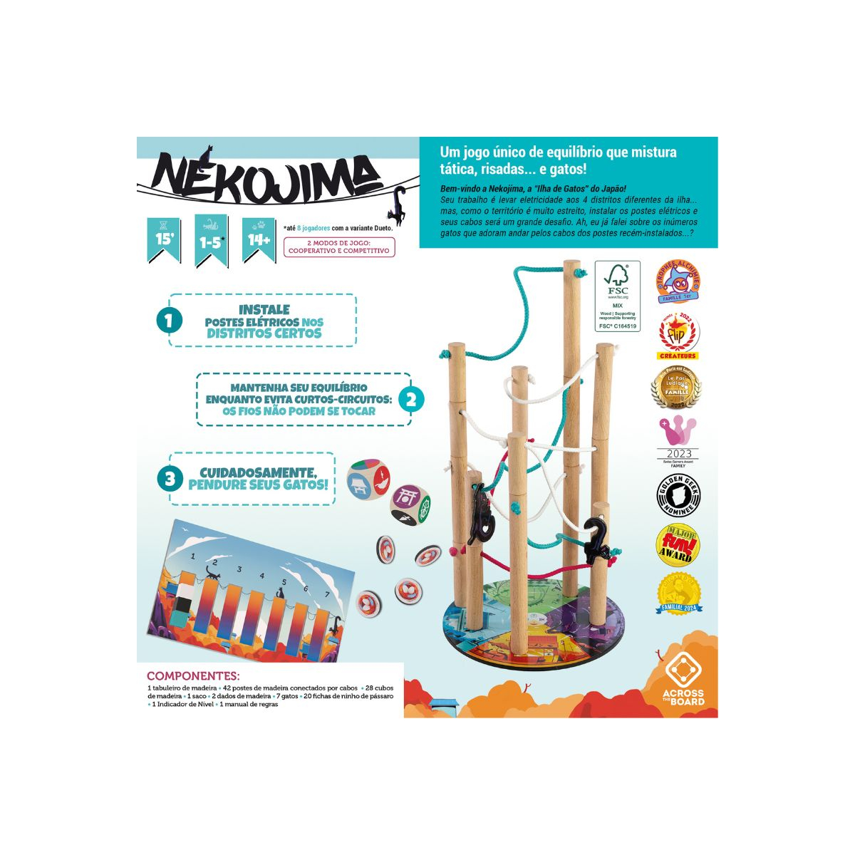 Nekojima é um jogo de habilidade e destreza em madeira no qual você terá que manter uma instalação inteira em equilíbrio. Os jogadores devem se revezar colocando ou empilhando Denchuu 電柱 (Postes Elétricos) respeitando os locais sem que nenhum cabo pendurado se toque. Mas tome cuidado para não ser o único a derrubar a estrutura. Este jogo requer reflexão, concentração e habilidade.