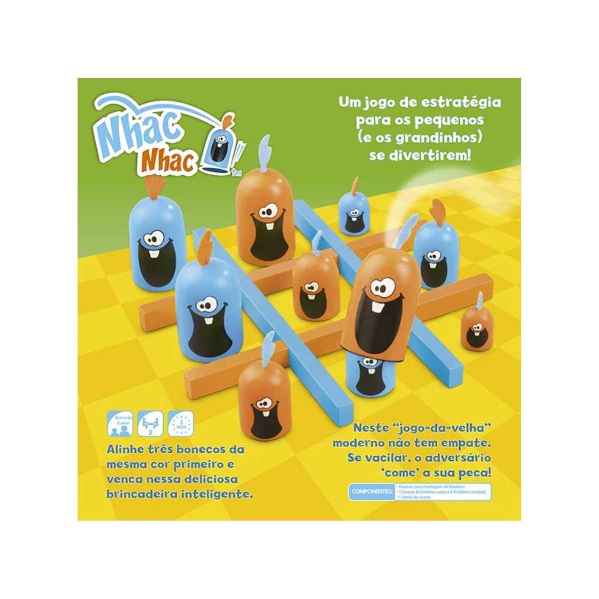 Nhac Nhac é um jogo de estratégia em que crianças e adultos se divertem partida atrás de partida. É como um jogo-da-velha moderno, mas mais engraçado, porque é possível “comer” a peça do oponente para ocupar o espaço desejado.
