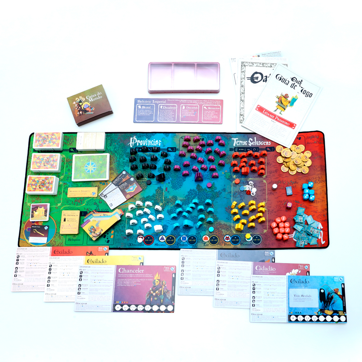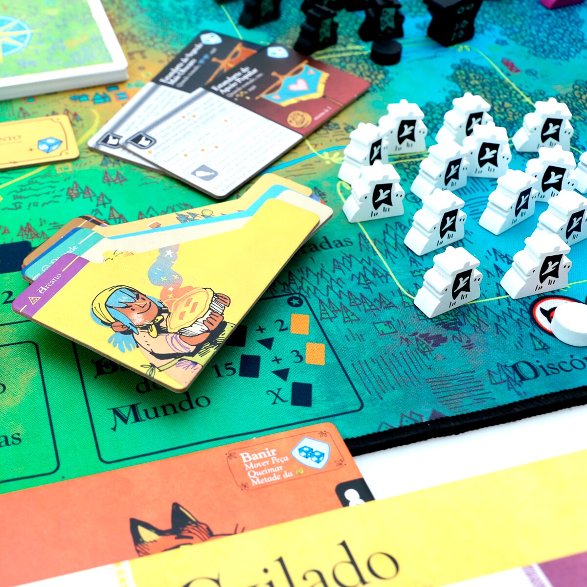 Prepare e guarde seu jogo com facilidade usando divisores de cartas, um tabuleiro em neoprene costurado e um organizador de plástico. (com espaço para cartas com sleeves!)