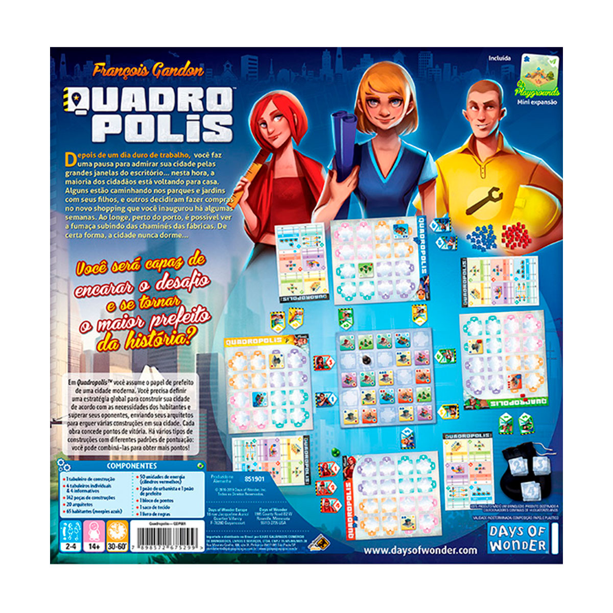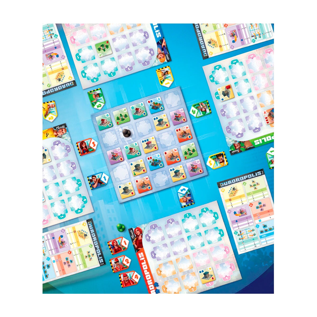 Em Quadropolis você assume o papel de prefeito de uma cidade moderna. É necessário estabelecer uma estratégia global para construir sua cidade de acordo com as necessidades dos habitantes e superar seus oponentes, enviando seus arquitetos para erguer várias construções em sua cidade. Cada obra concede pontos de vitória. Há vários tipos de construções com diferentes padrões de pontuação: você pode combiná-las para obter mais pontos! Com dois modos de jogo, Quadrópolis propõe desafio para jogadores casuais e também para os mais experientes. Será que você será capaz de tornar-se o maior prefeito da história?
