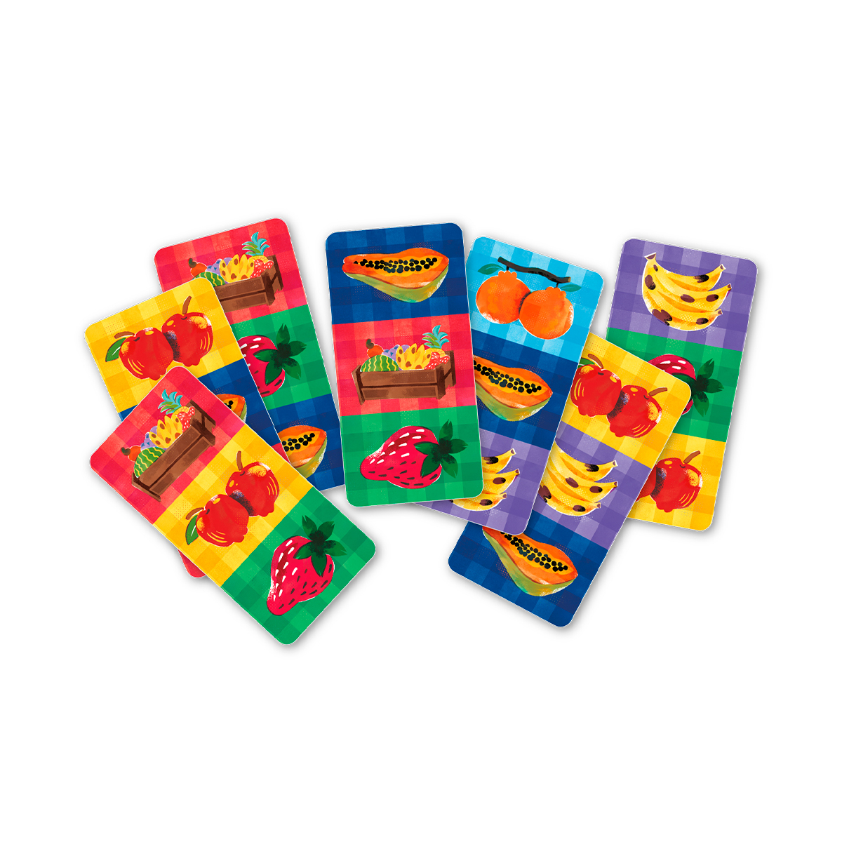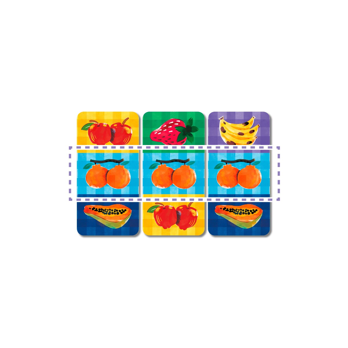 Em Qui-Quitanda, trabalhe em conjunto com os outros jogadores para organizar suas sacolas de frutas, formando linhas (horizontais ou diagonais) para conquistar pontos.