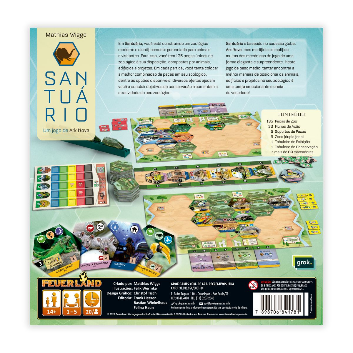 Santuário é baseado no sucesso global Ark Nova, mas modifica e simplifica muitas das mecânicas do jogo de uma forma elegante e surpreendente. Neste jogo de peso médio, tentar encontrar a melhor maneira de posicionar os animais, edifícios e projetos no seu zoológico é uma tarefa emocionante e cheia de variedade!