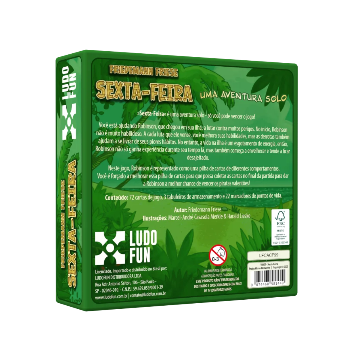 Sexta-Feira é um jogo solo tático e desafiador criado por Friedemann Friese, no qual você assume o papel de Sexta-Feira tentando ajudar Robinson Crusoe a sobreviver em uma ilha deserta. Robinson é inicialmente inábil, mas ao enfrentar perigos e desafios, suas habilidades evoluem — desde que ele sobreviva tempo suficiente.