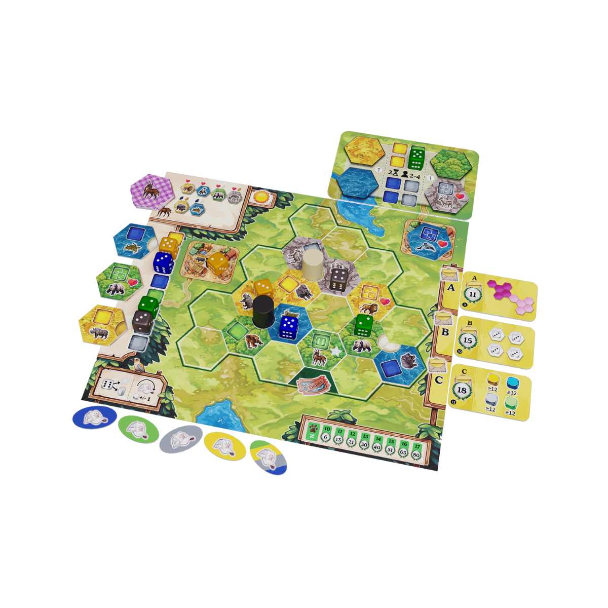 Durante o jogo, você seleciona peças e dados de animais, onde os dados representam comida para os animais. A cor dos dados deve corresponder à cor do habitat das peças dos animais. Cada turno fornece uma tomada de decisão crucial onde você precisa considerar se deve escolher um dado de um determinado valor ou garantir uma peça de animal que pode não estar disponível novamente.
