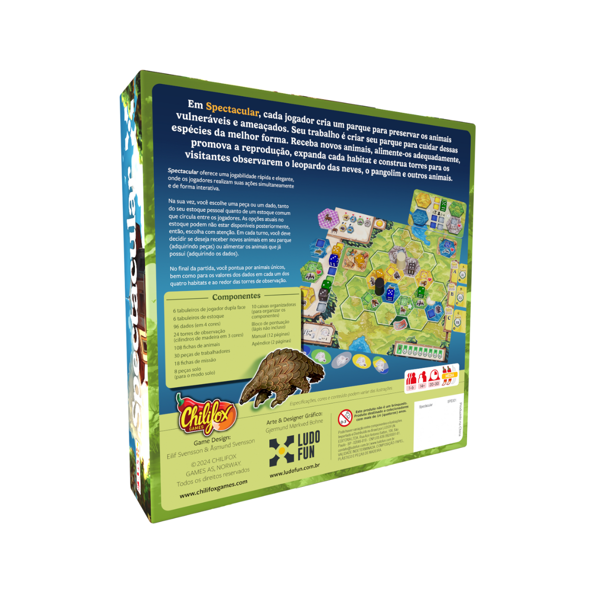 Spectacular proporciona jogo simultâneo e garante interação entre os jogadores, pois as decisões de seus oponentes afetarão quais peças e dados estarão disponíveis para você. O jogo também vem com tabuleiros de jogadores assimétricos (nas costas).