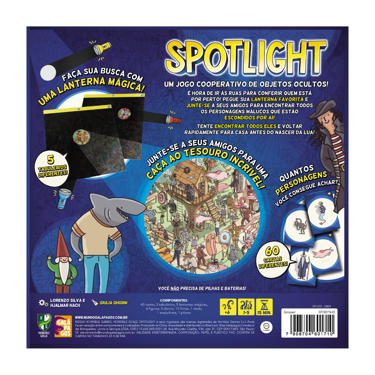 Spotlight é um jogo cooperativo de objetos ocultos que vai desafiar sua percepção e trabalho em equipe. Ideal para crianças a partir de 6 anos, ele combina diversão rápida e dinâmica, com partidas de cerca de 15 minutos para 1 a 5 jogadores.