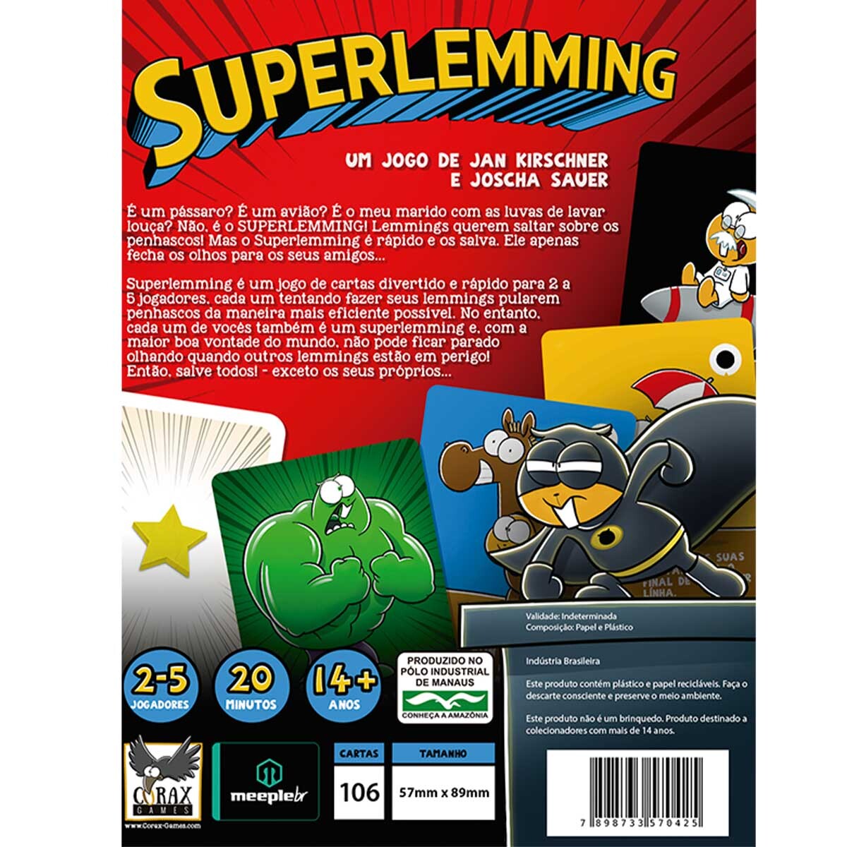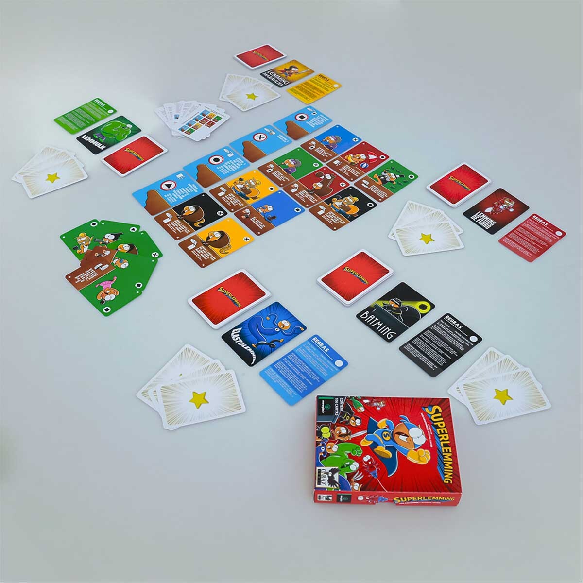 Em SuperLemming você tem um jogo rápido de cartas para 2 a 5 jogadores, em que você precisa salvar os lemmings dos outros jogadores e jogar os seus do penhasco até que um dos jogadores não tenha mais cartas em sua mão. Após a contagem de pontuação, quem tiver mais pontos, vence.