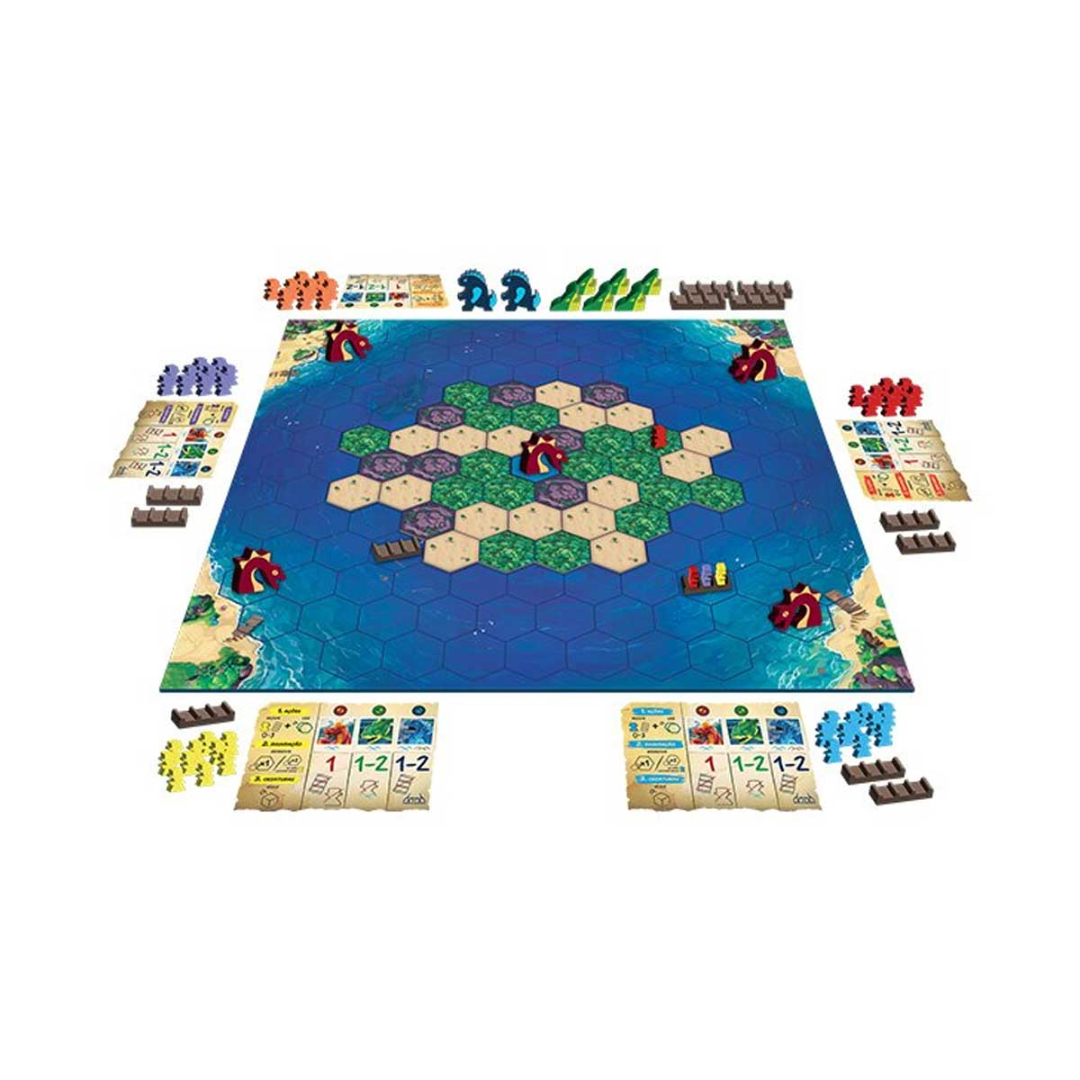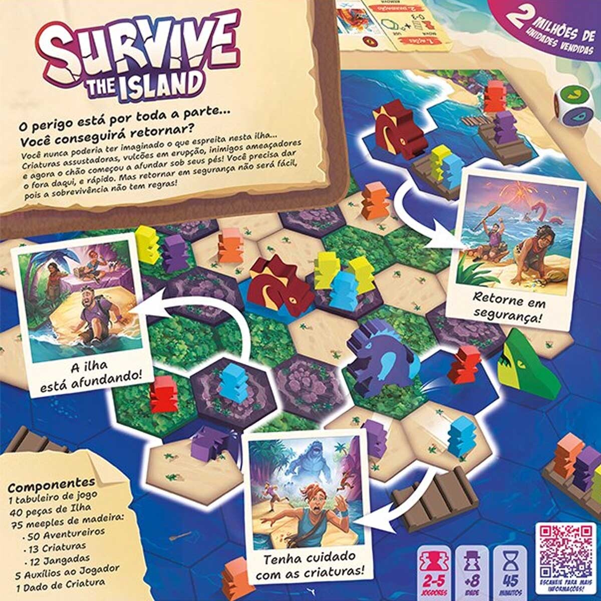 Em Survive: The Island, você joga com uma equipe de 10 Aventureiros e cada um carrega um tesouro, cujo valor é indicado na base dele. Salve tantos tesouros quanto puder, e garanta que nenhuma Criatura pegue seus Aventureiros enquanto você os leva para as Ilhas de Resgate... E tudo antes de 3 dos 4 Vulcões entrarem em erupção!