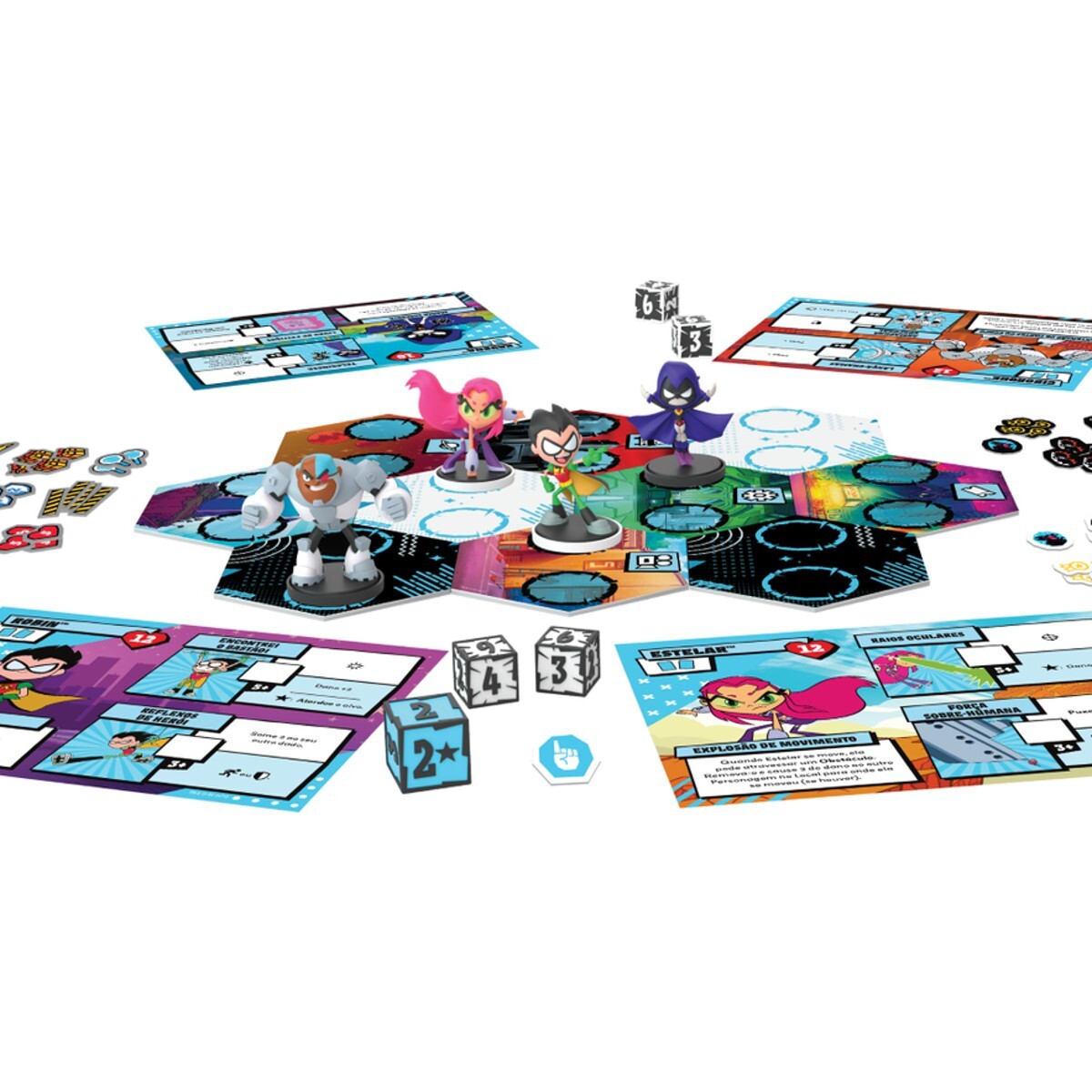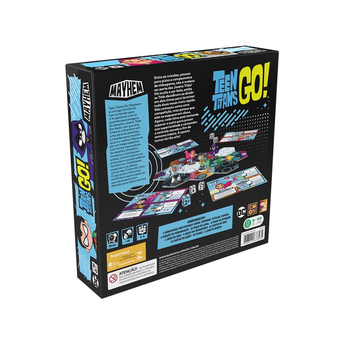 Os Jovens Titãs estão prontos para desencadear o caos de Mayhem - entre as batalhas, pausas para pizza e campeonatos de videogame, não é moleza ser parte dos Jovens Titãs! A caixa de Teen Titans GO! traz os personagens: Robin, Cyborg, Estelar e Ravena.