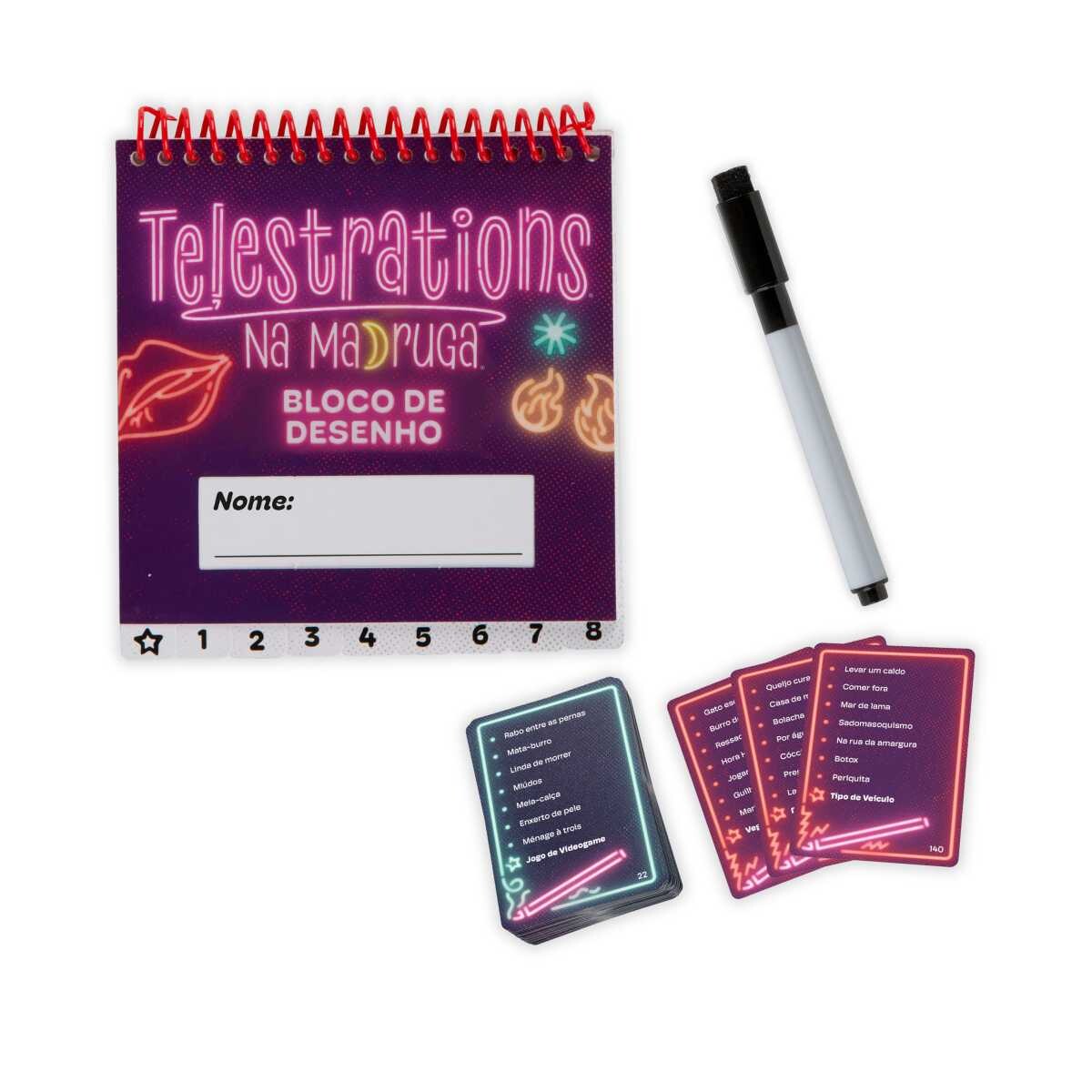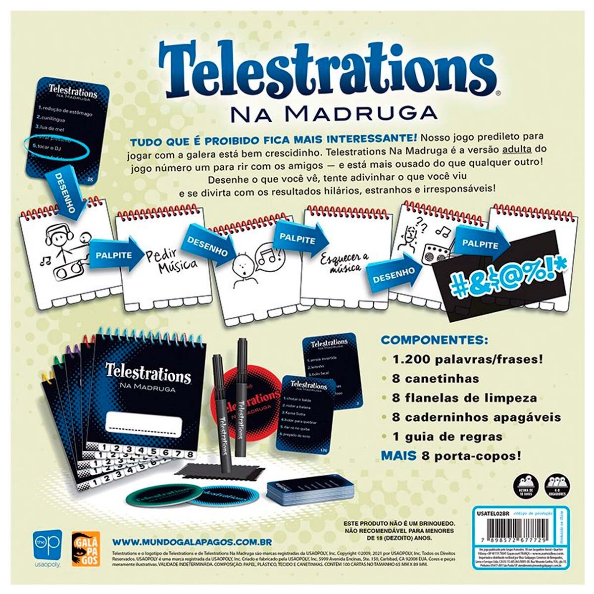 Telestrations: Na Madruga tem a mesma gameplay que o jogo original, mas com as cartas de palavras trazendo centenas de dicas com teor adulto, além da de oito porta-copos dentro da caixa.