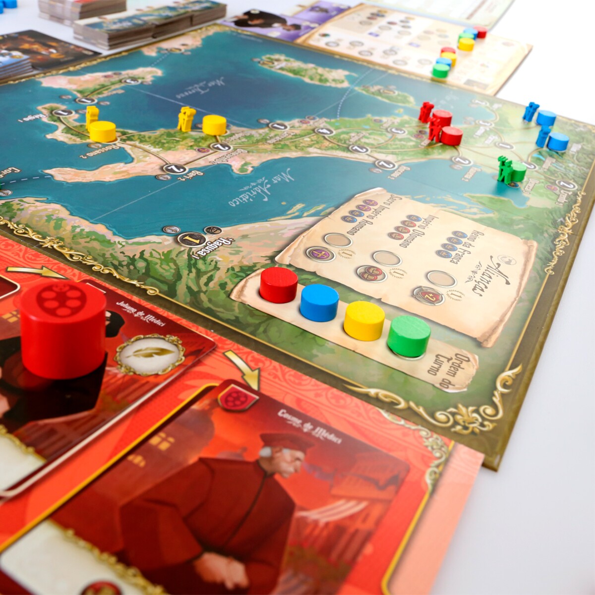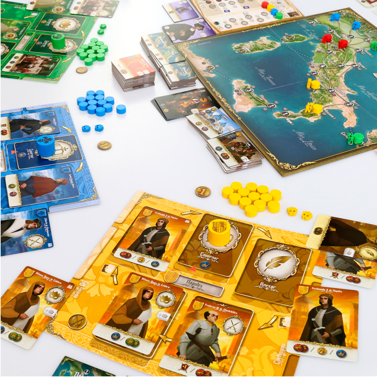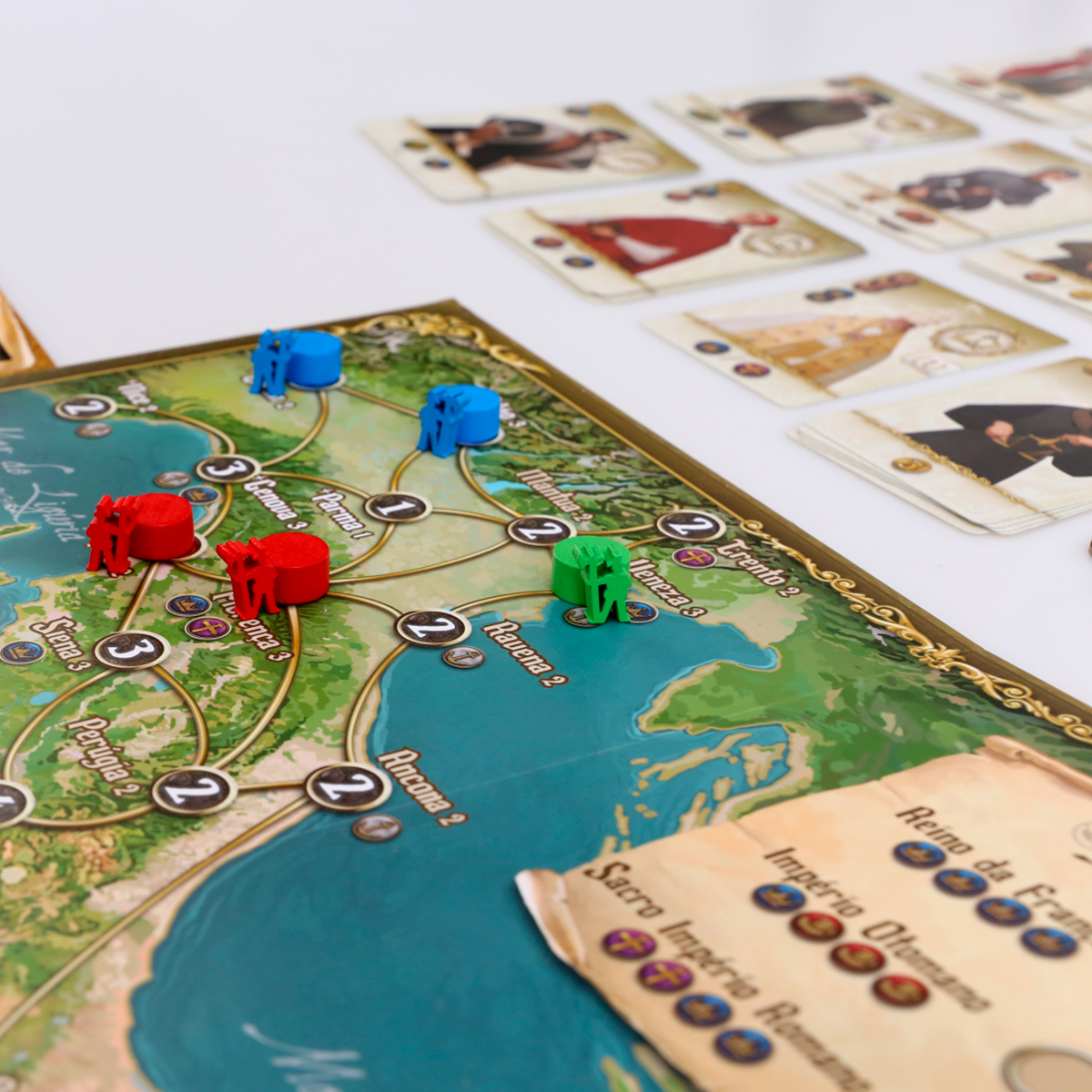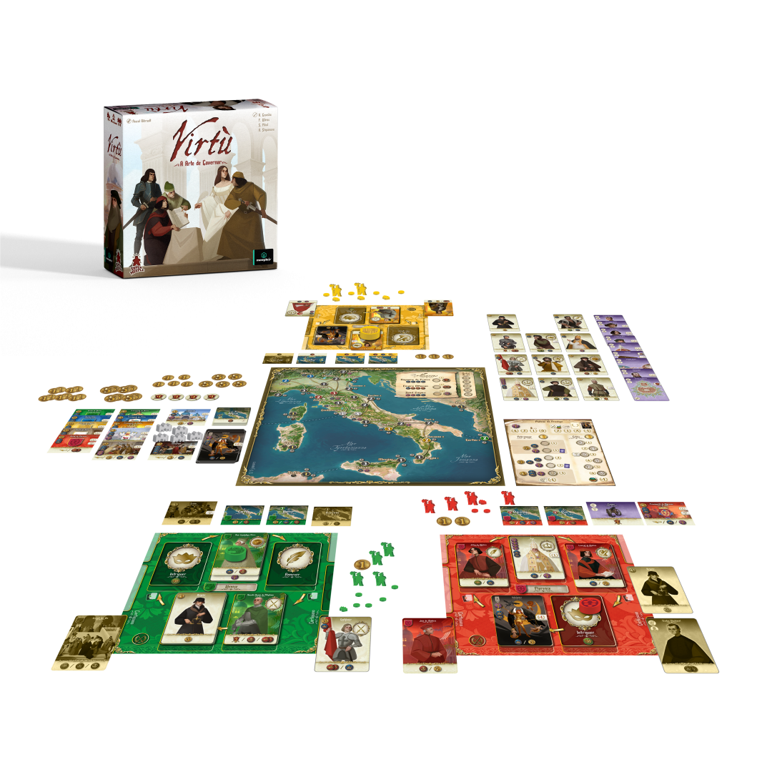 Virtù modela a arte de governar, usando um mecanismo original implementado no seu tabuleiro de jogador. Suas opções táticas são organizadas na forma de um círculo de cartas que pode evoluir de acordo com seus objetivos. Envie tropas ou posicione agentes, e os vilarejos mudarão de dono.
