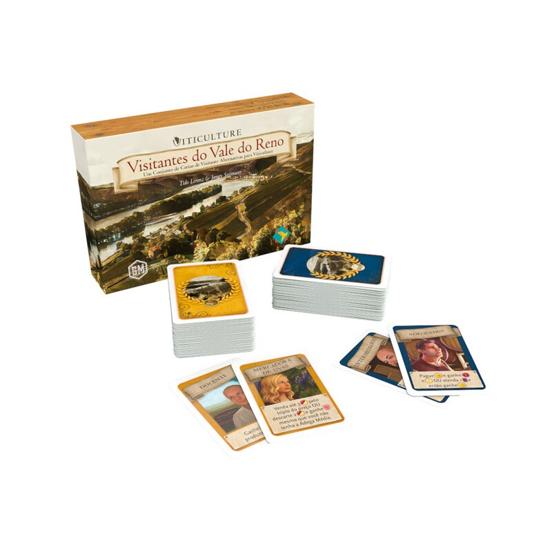 Você tem novos visitantes! Visitantes do Vale do Reno, uma expansão para Viticulture, oferece-lhe um novo conjunto de oitenta cartas de visita, que se concentram menos nos pontos de vitória e mais no próprio negócio do vinho. Estas cartas têm as suas próprias costas únicas, pois devem ser jogadas sem outras cartas de visitante de Viticulture, da Toscana e dos Visitantes Moor.