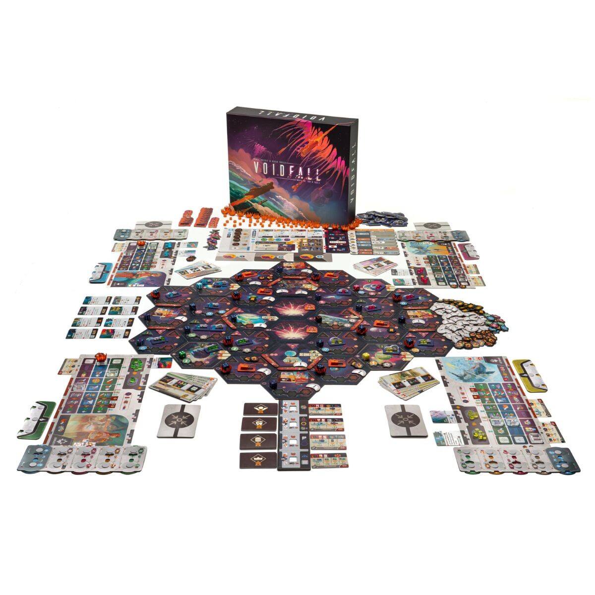 Voidfall combina a tensão, a grande estratégia e a profunda customização de império do gênero 4X com a gestão de recursos, decisões apertadas e baixa dependência de sorte dos jogos econômicos do estilo Euro. Como líder de uma Grande Casa desafiadora, você joga durante três Ciclos, cada um com um Evento Galáctico que muda o jogo e determina uma quantidade de Cartas de Foco que podem ser jogadas. Escolher as Cartas de Foco e sua ordem são a peça central do jogo. Ao selecionar duas das suas três ações impactantes, você desenvolve e melhora Tecnologias; avança nas Trilhas de Civilização específicas da sua Casa; gerencia a infraestrutura, população e produção dos seus Setores; personaliza as suas próprias condições de pontuação; elimina a Corrupção cósmica; e conquista novos Setores com até cinco tipos diferentes de Frotas espaciais. Batalhas espaciais são travadas contra as forças corrompidas do Nascido do Vazio ou contra outros jogadores. Em vez de depender da sorte da rolagem de um dado, as batalhas em Voidfall são totalmente deterministas e recompensam a grande estratégia, preparação cuidadosa e ser mais esperto do que seus oponentes.